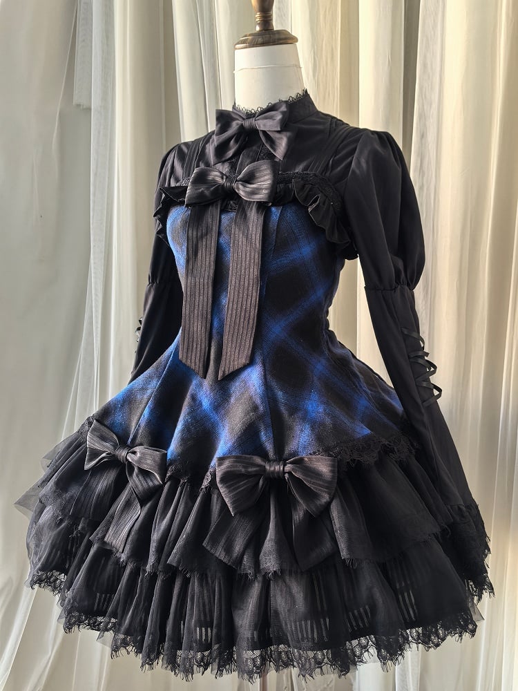 ブルーのチェック柄、黒のリボンで飾られた二重裾のゴシックロリータジャンパースカート