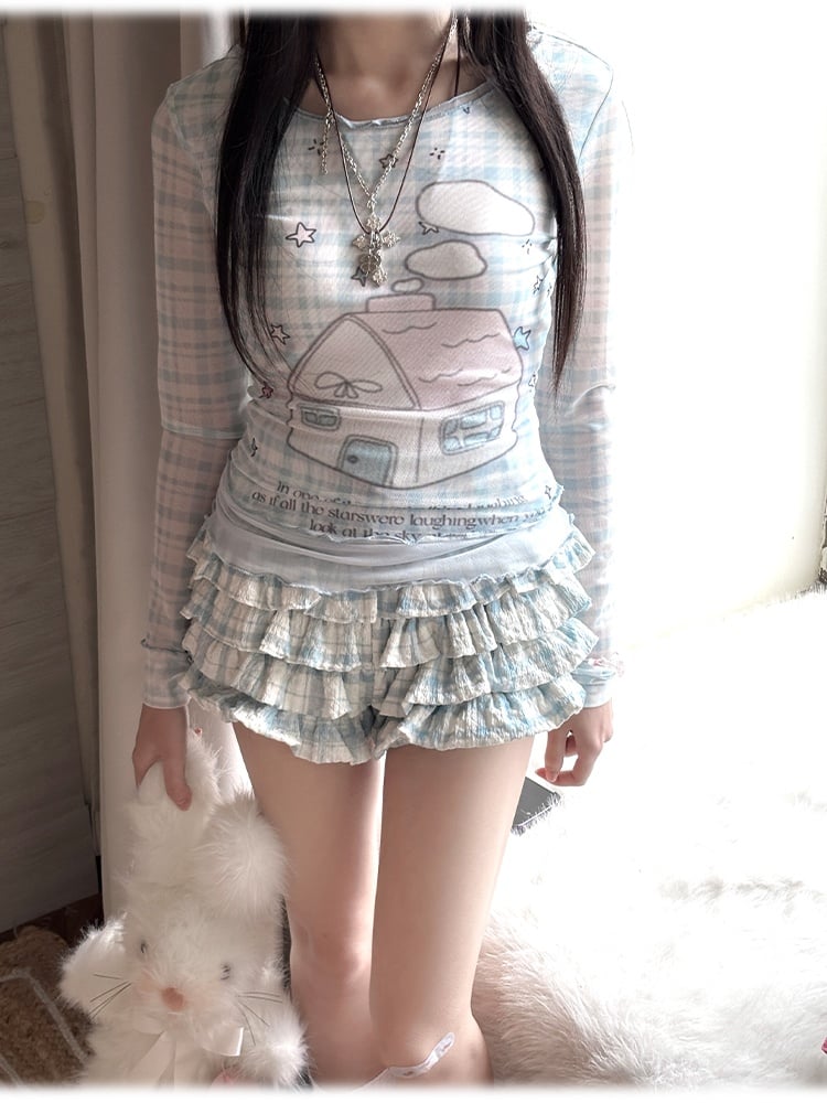 ブルーのチェック柄ティアードフリルスコートハウスプリントフェイクツーピーストップ/モダール