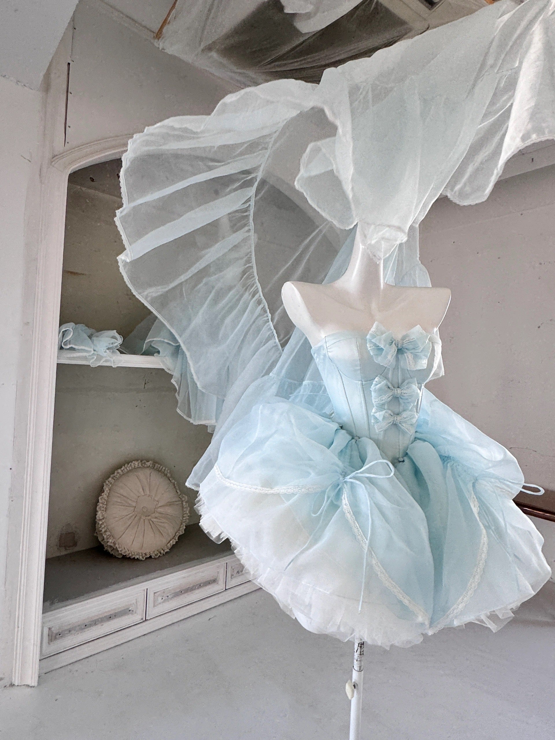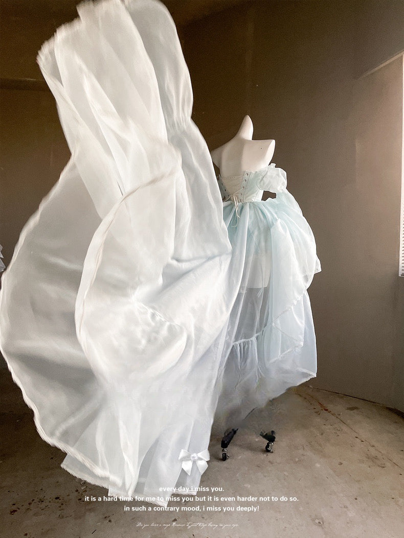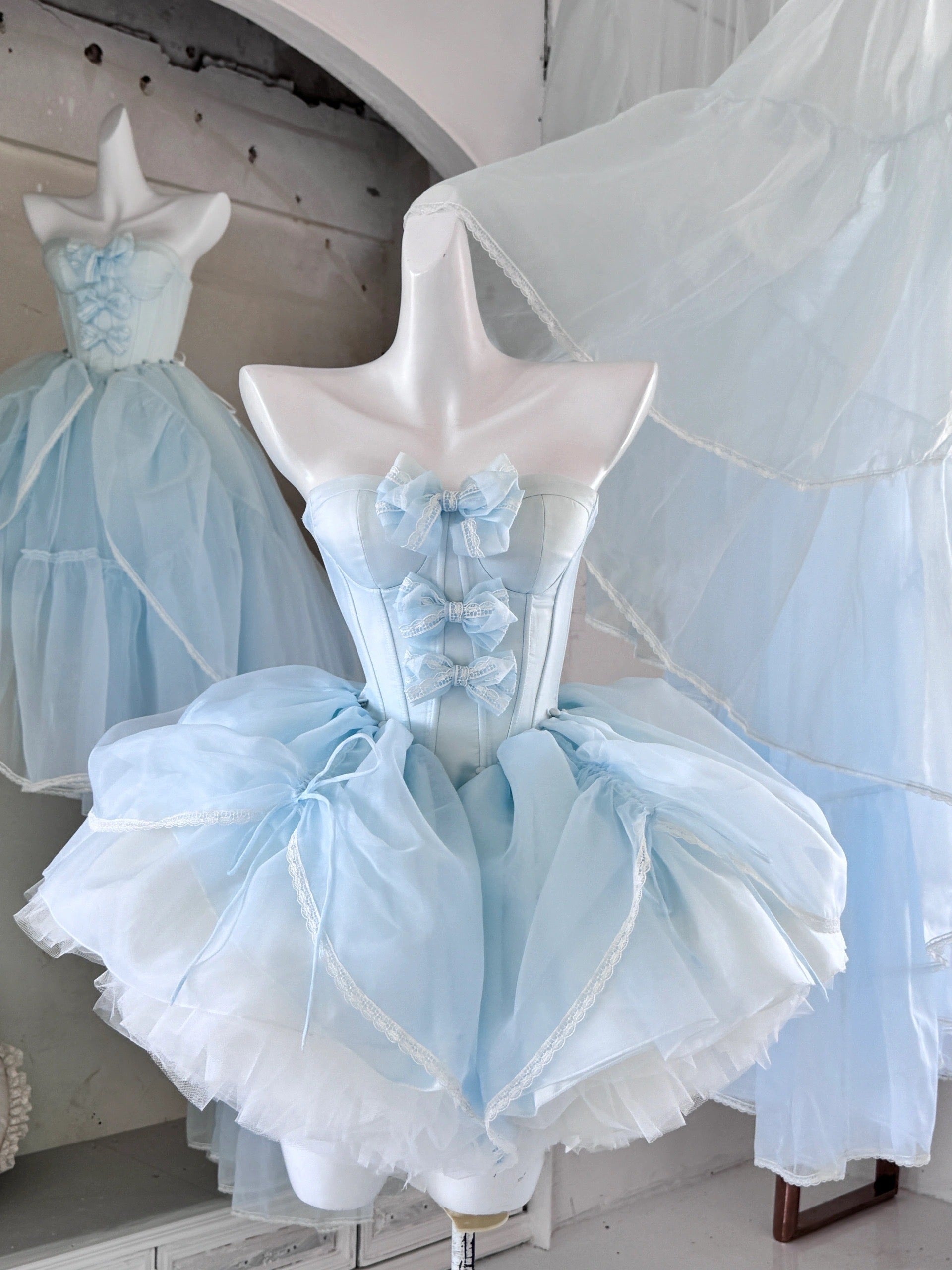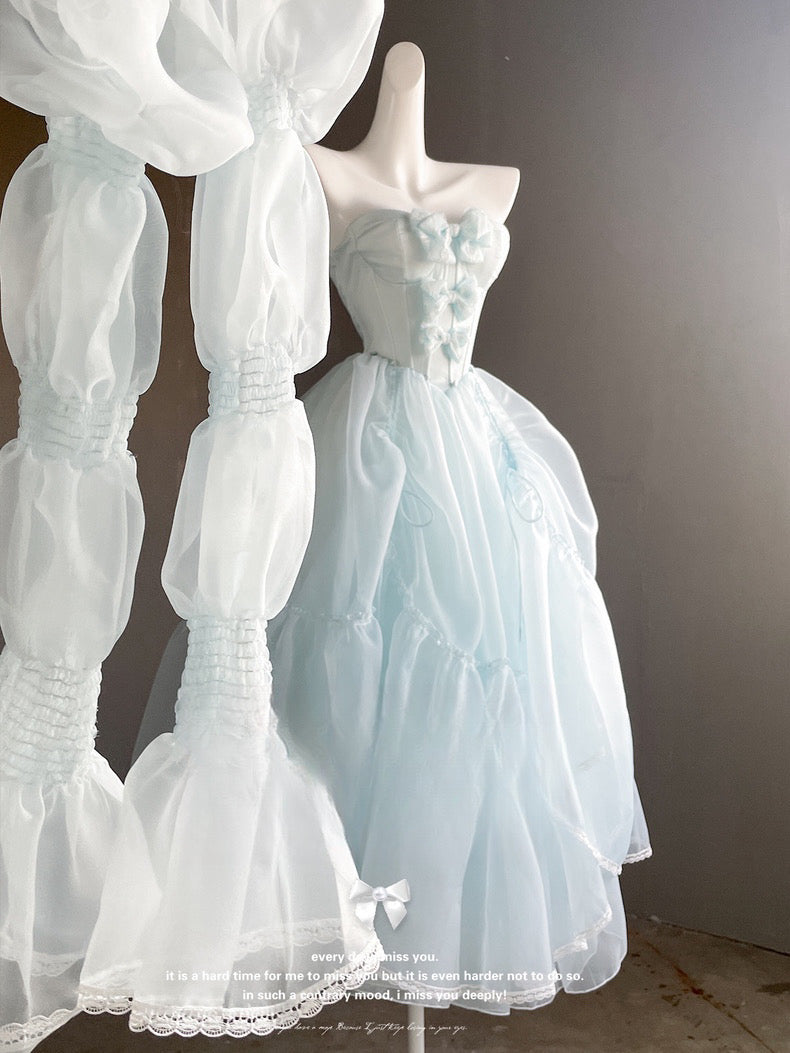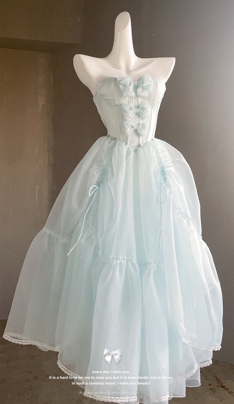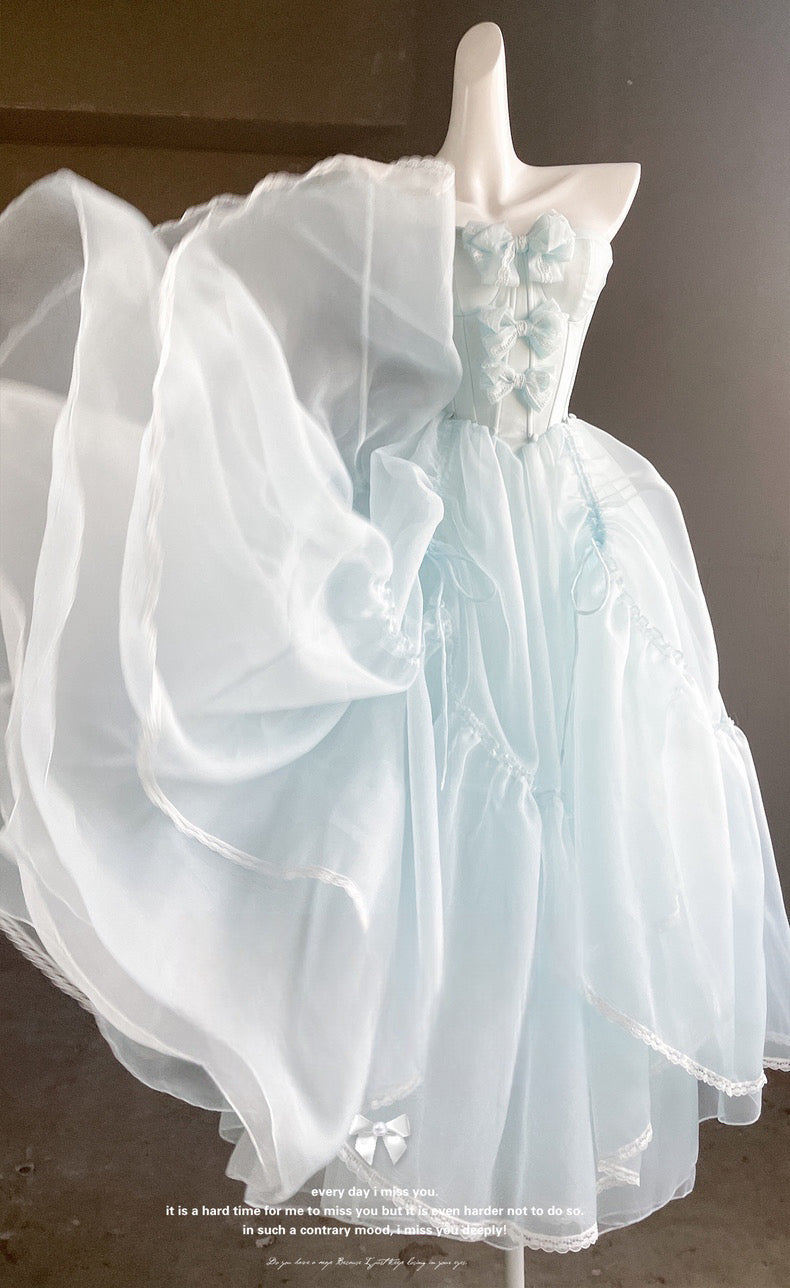 青と白のオールドスクールロリータファッションドレス 蝶結びディテール JSK セット