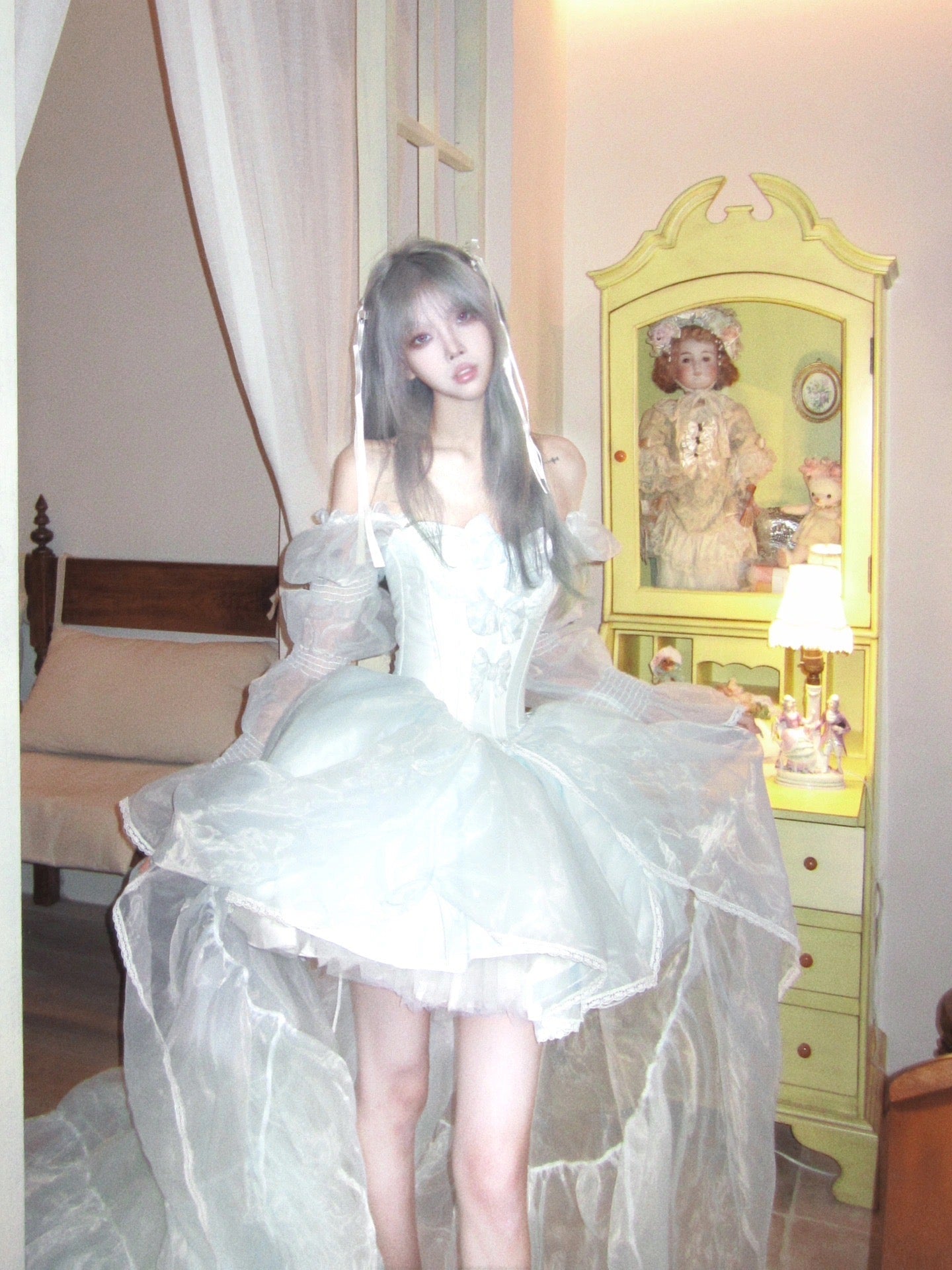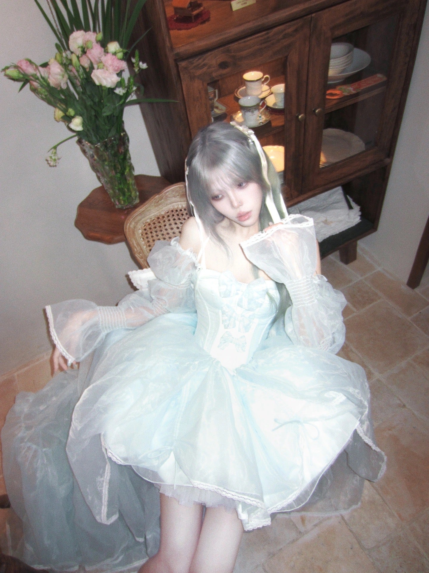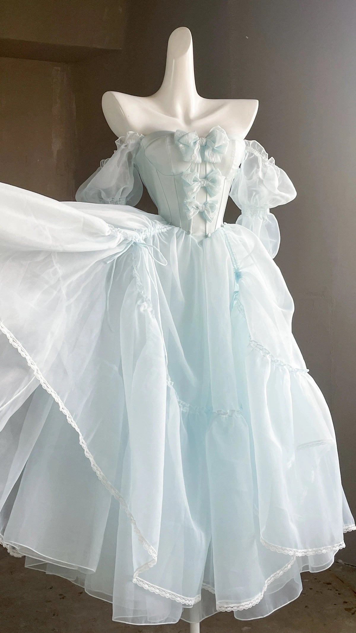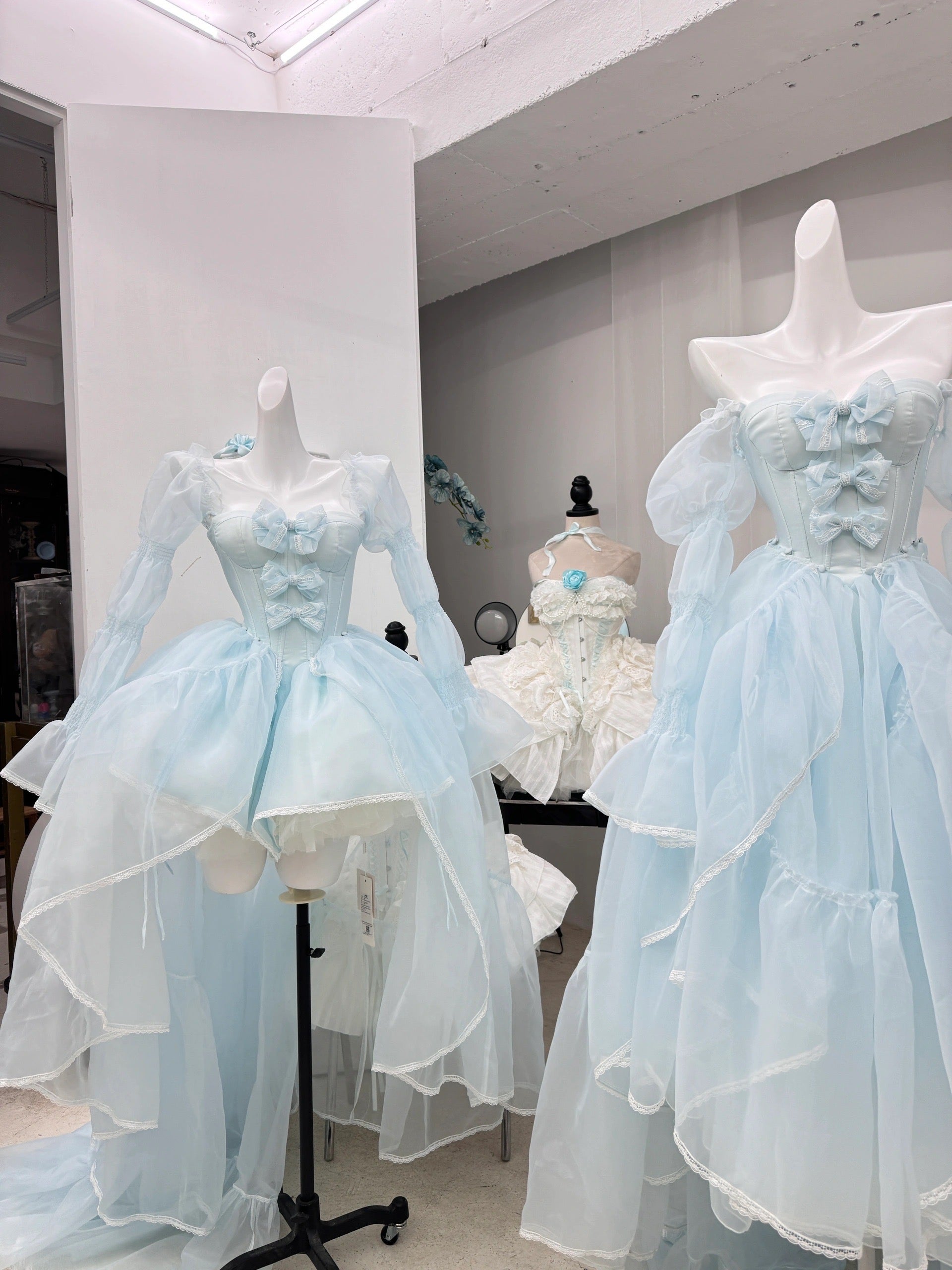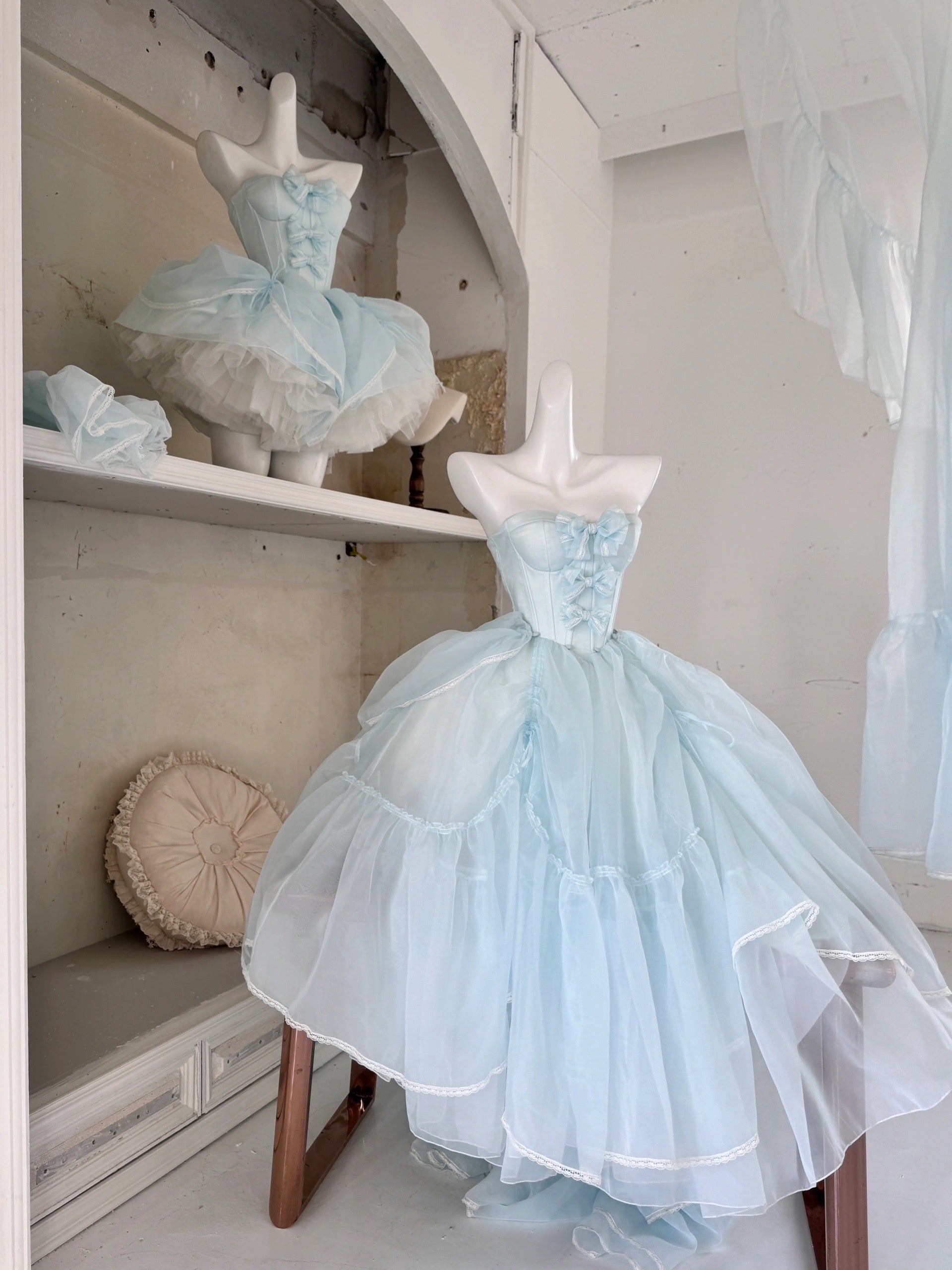 青と白のオールドスクールロリータファッションドレス 蝶結びディテール JSK セット