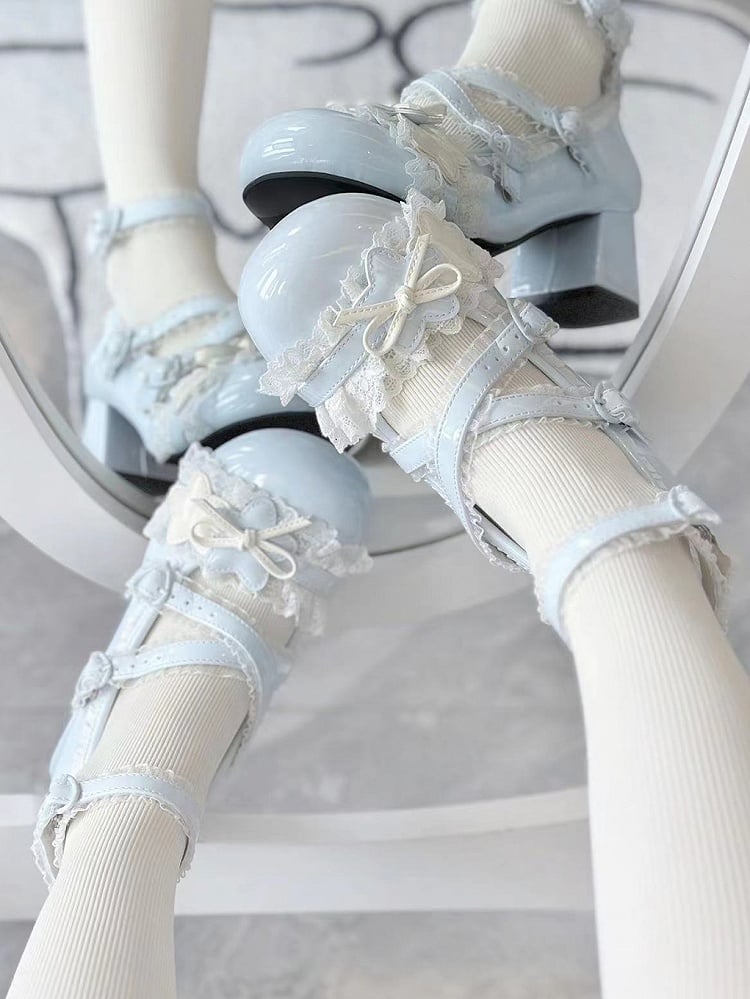 Sweet Blue Lolita Mary Janes in PU with Lace Edging, Star Decor and Romantic Heart Clasp