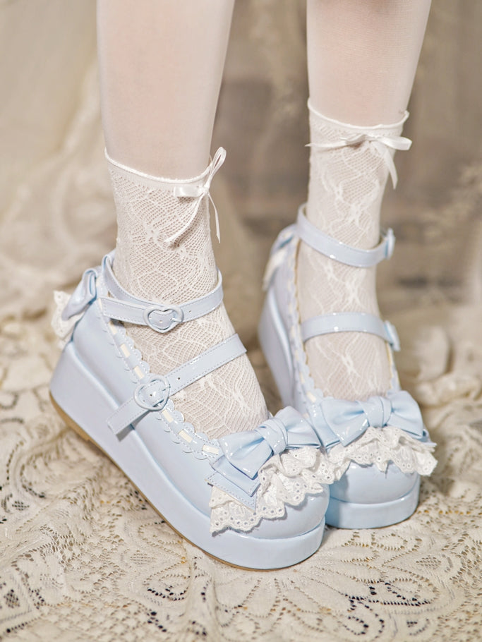 トップにベビーブルーのリボン、レーストリム、ハートバックル、プラットフォーム
