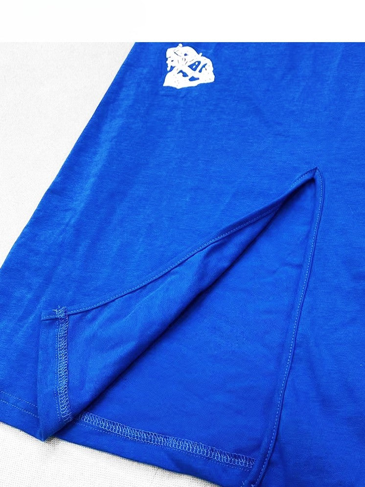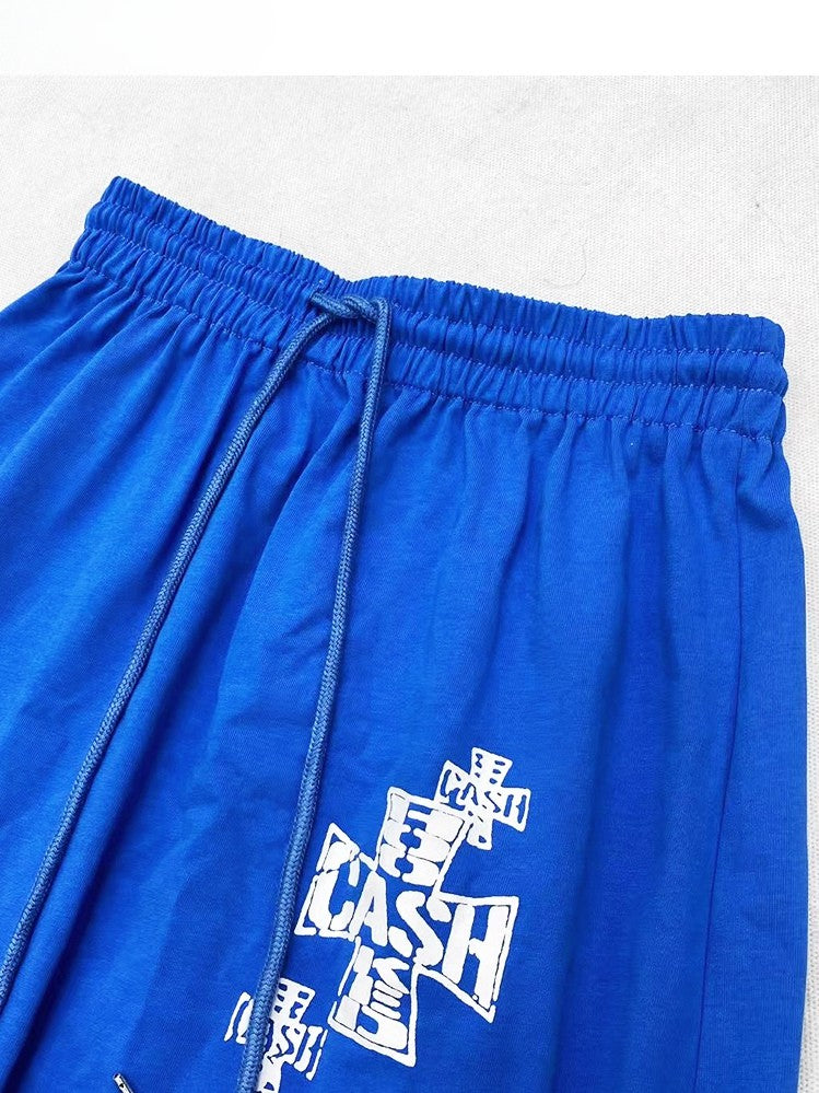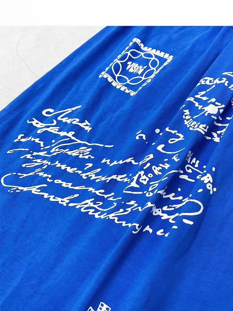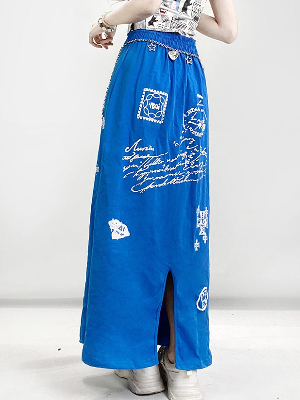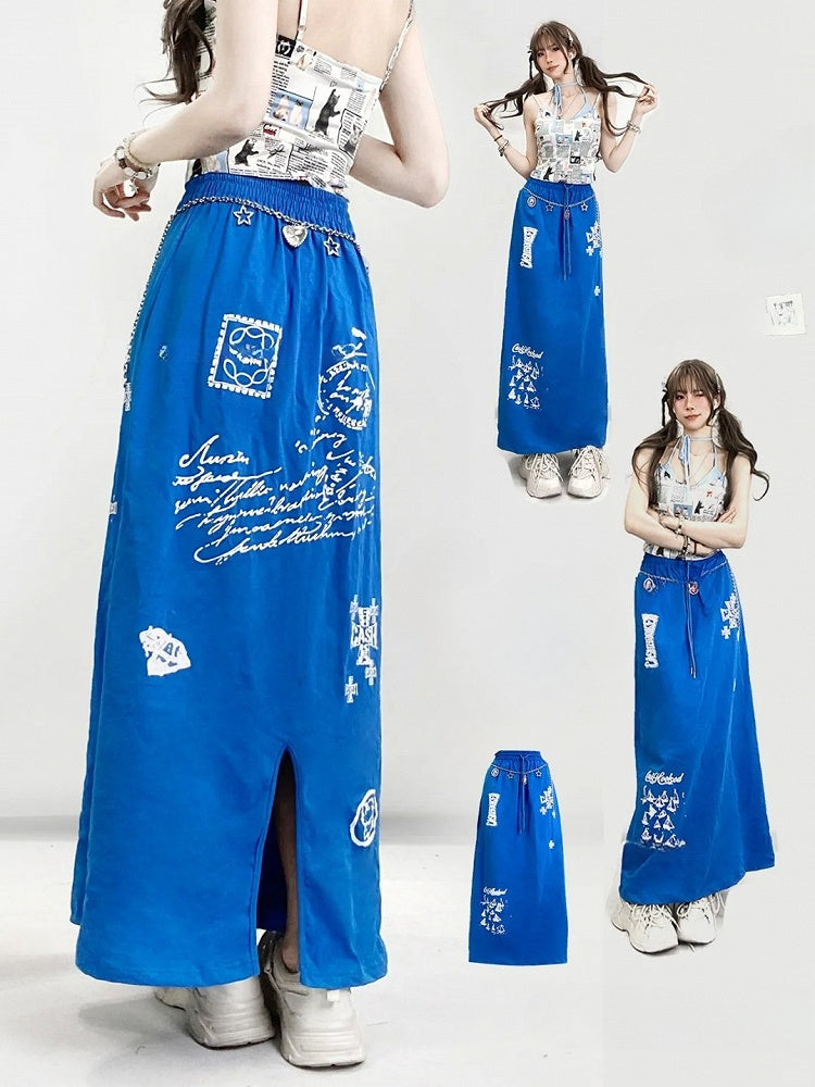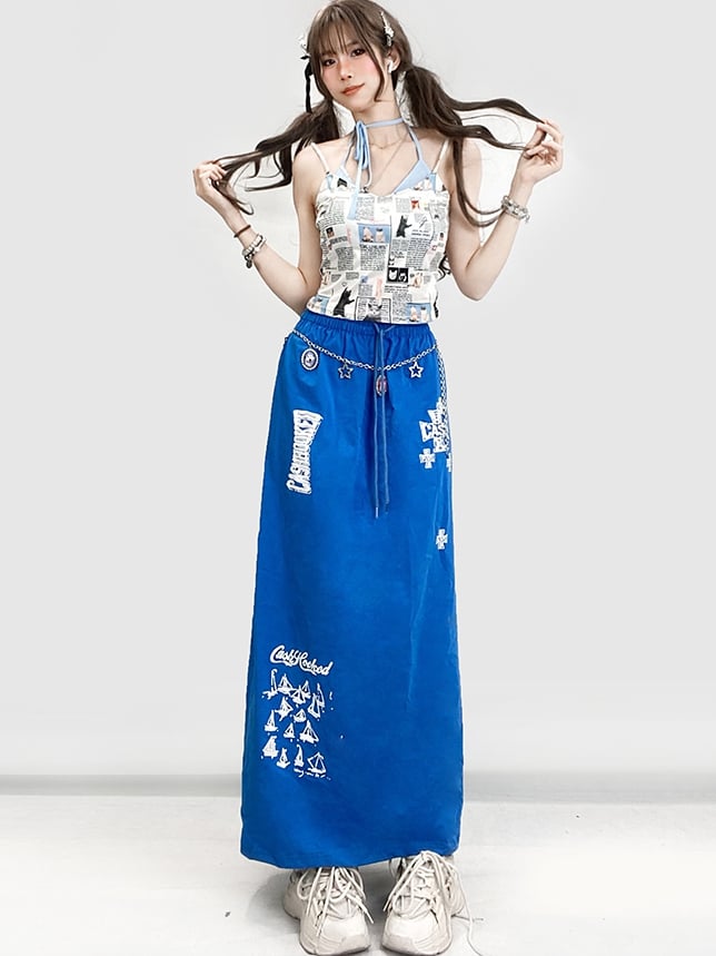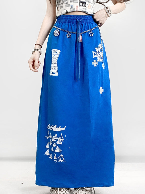 文字の帆船と十字架のプリントが施されたブルーのY2K Aラインスカート