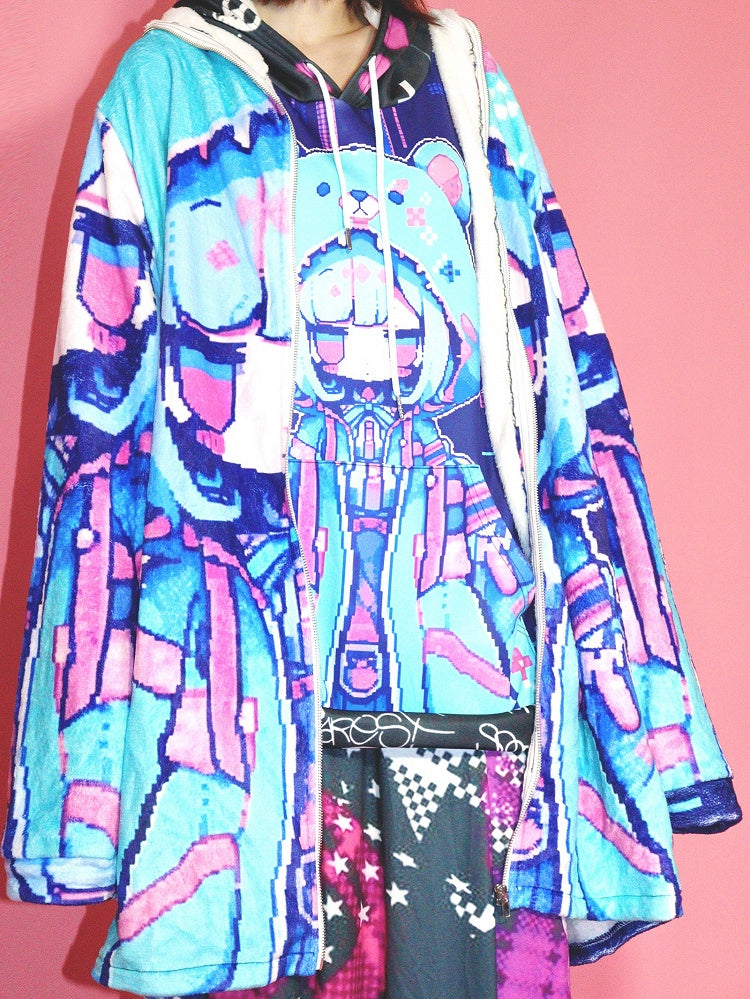 ブルーベリー Y2K ブルー フード付き ベア ジャケット プリント 漫画