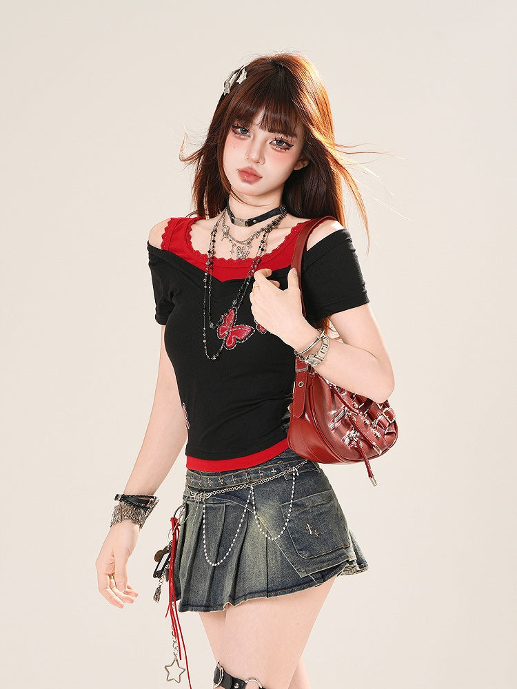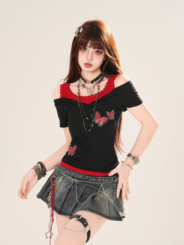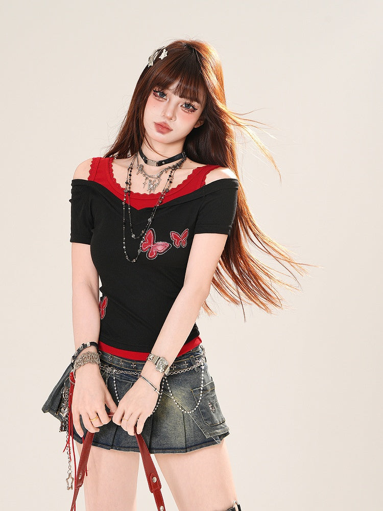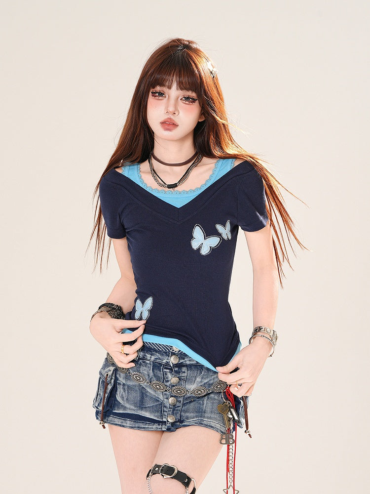 ブルー/レッドのバタフライアップリケフェイクツーピースTシャツ
