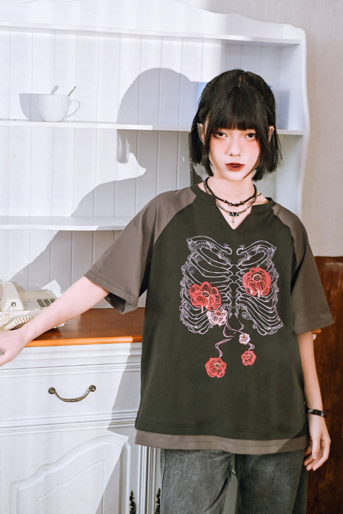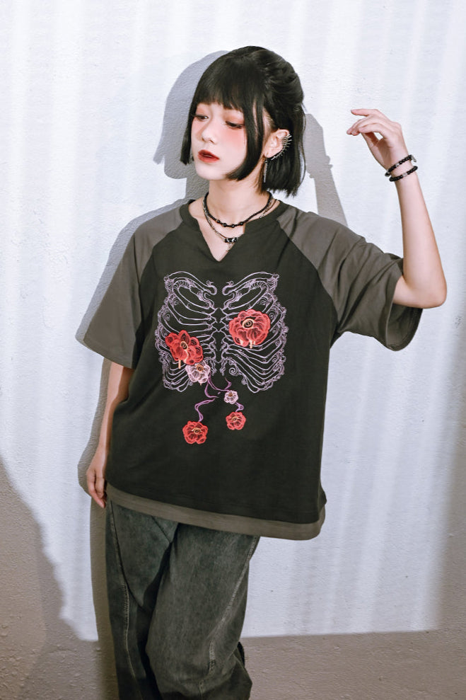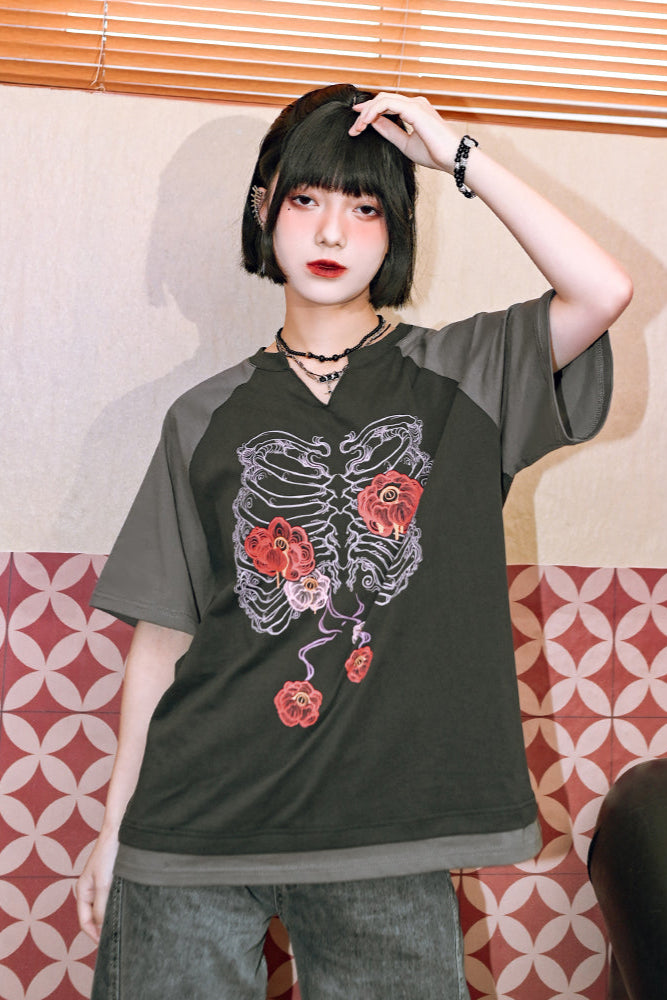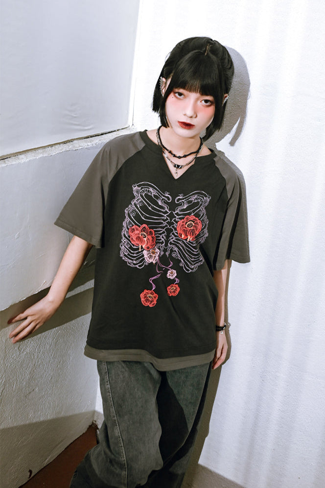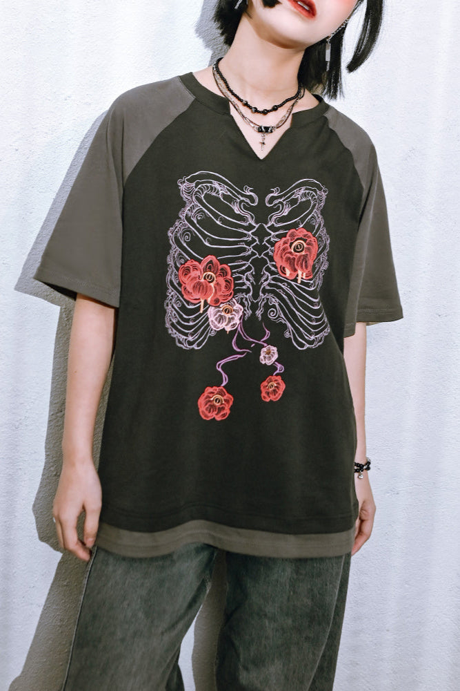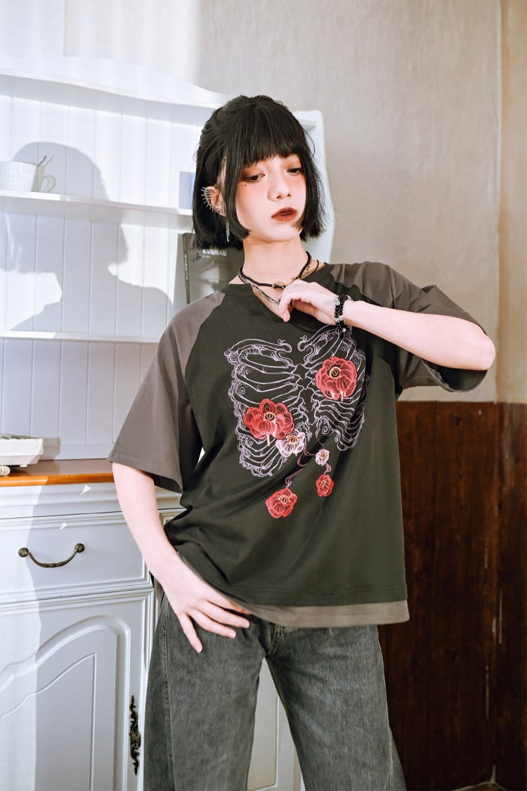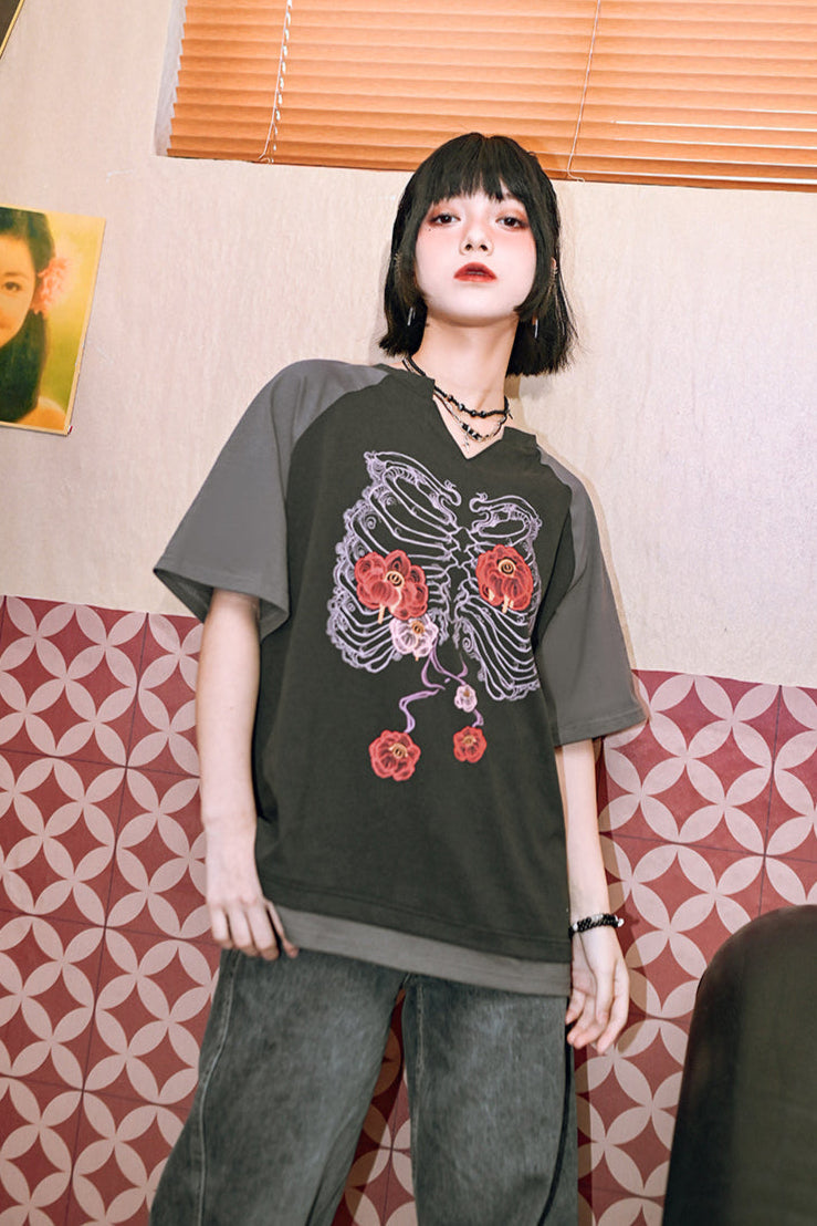 ❤フラワーボーン バイカラー ラグラン Vネック トップ❤