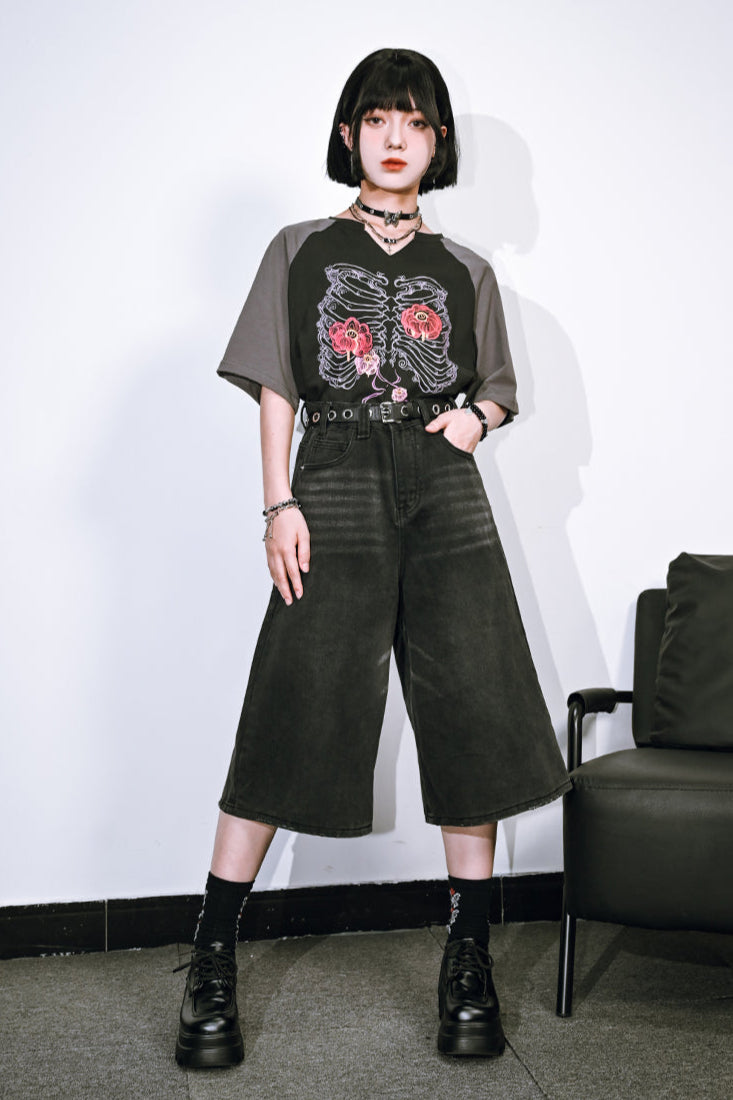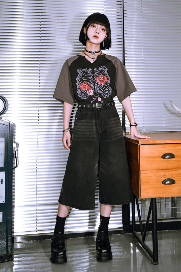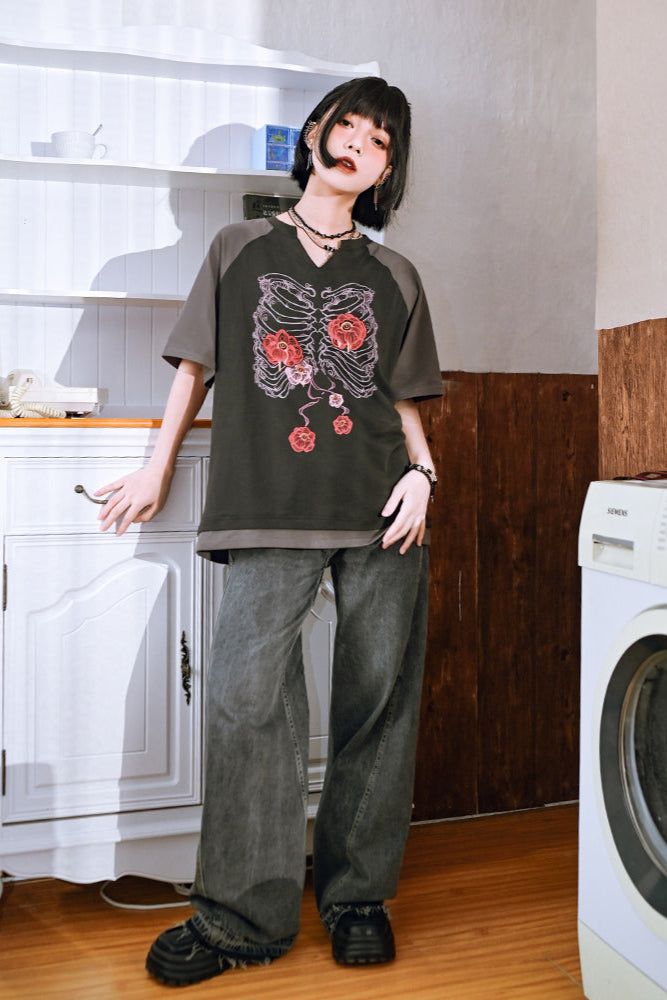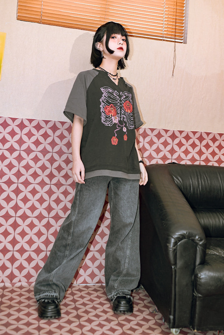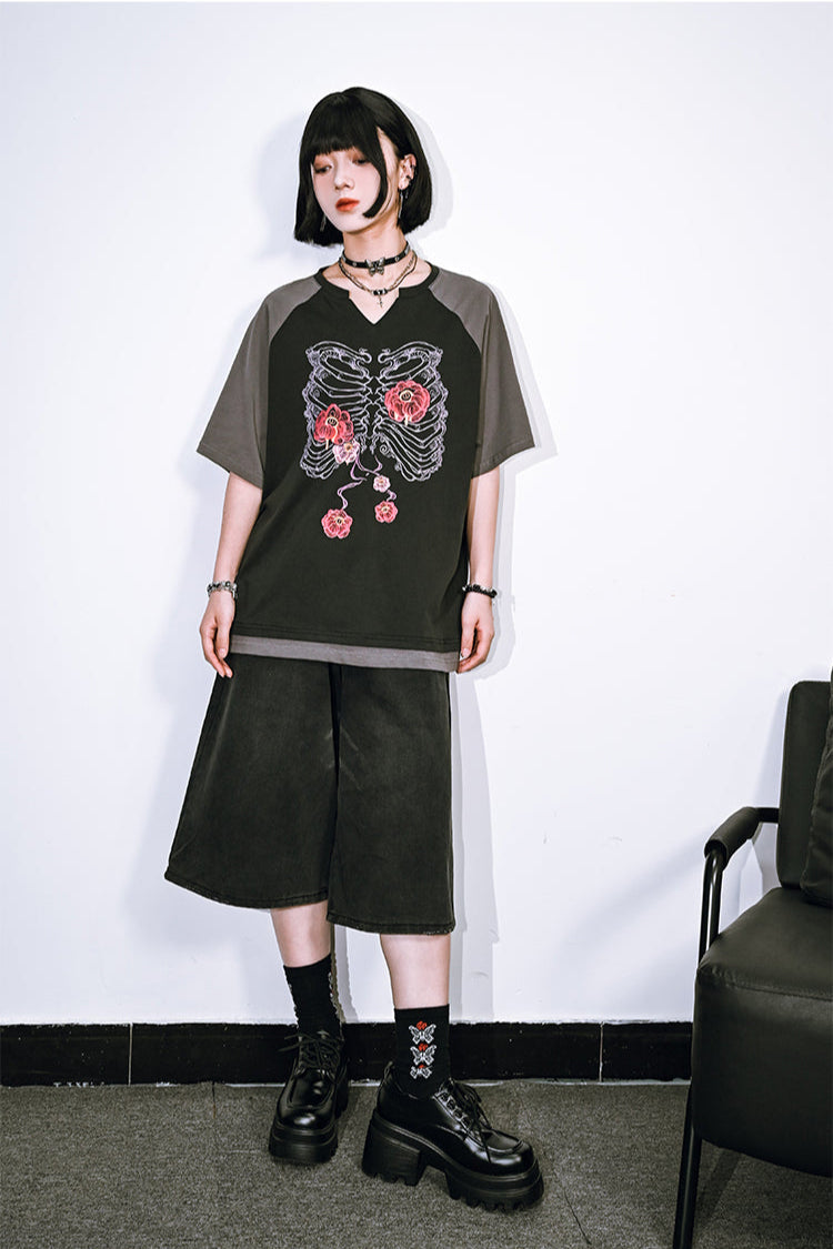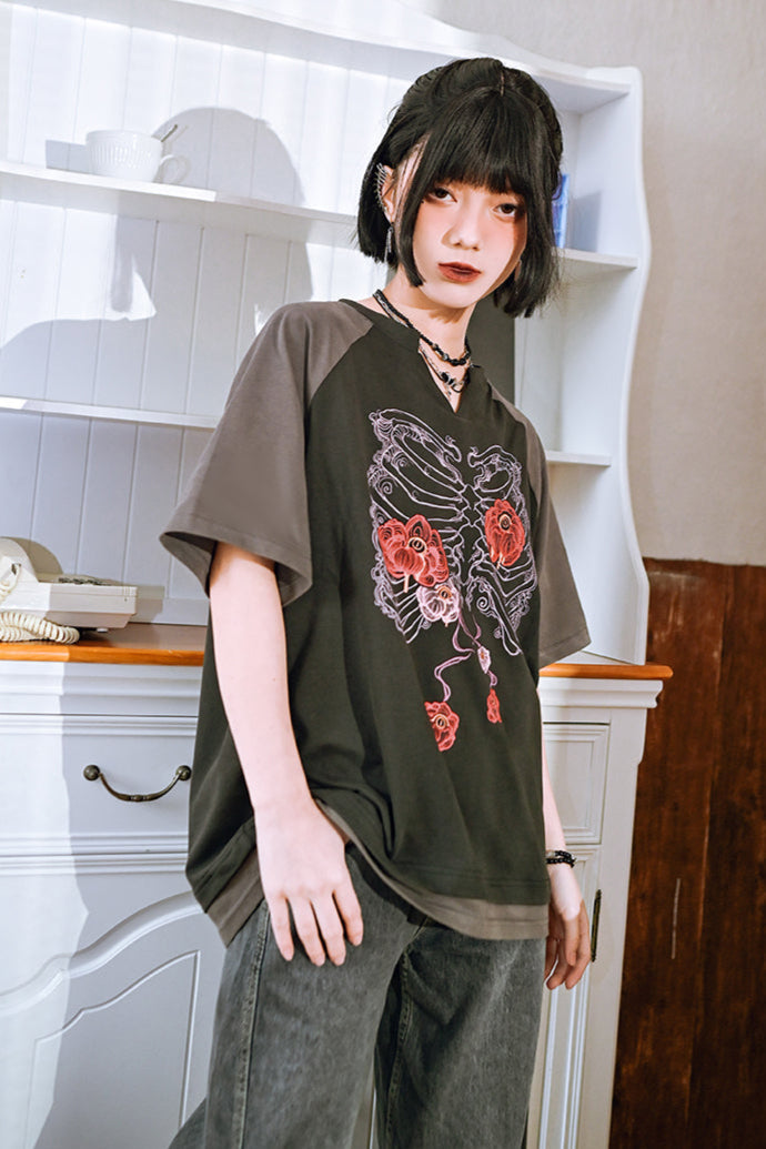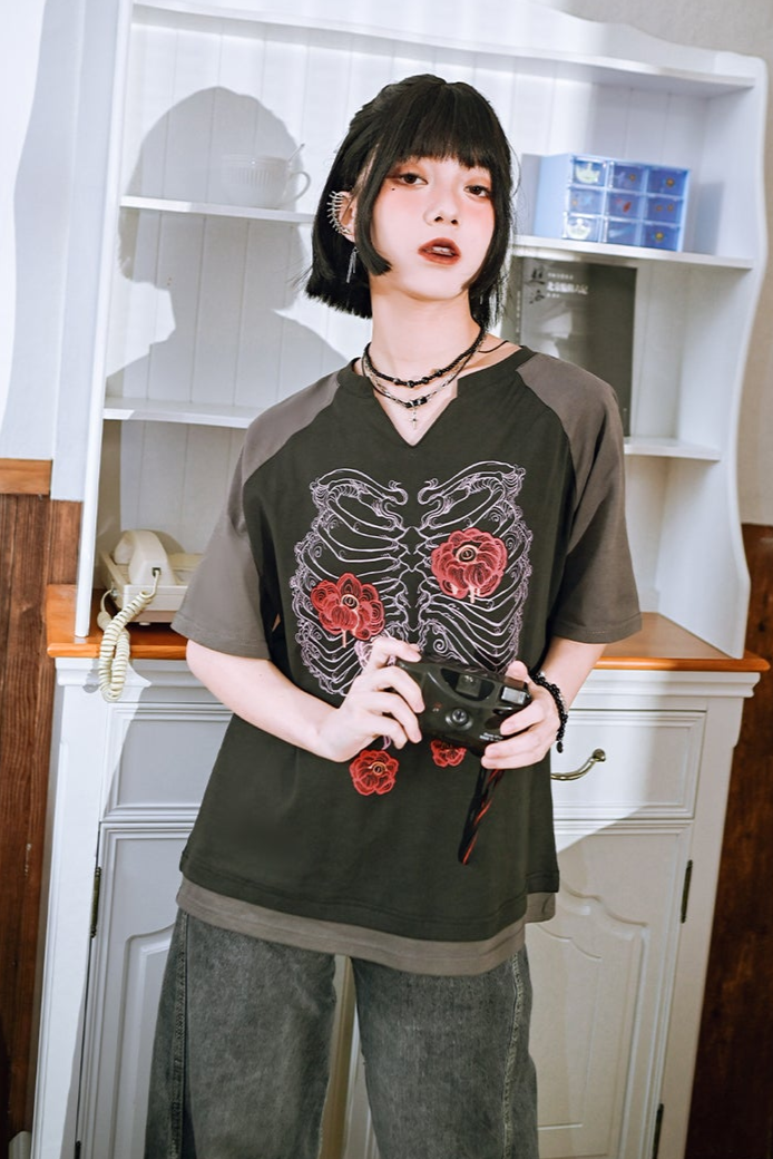 ❤フラワーボーン バイカラー ラグラン Vネック トップ❤