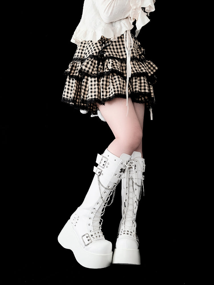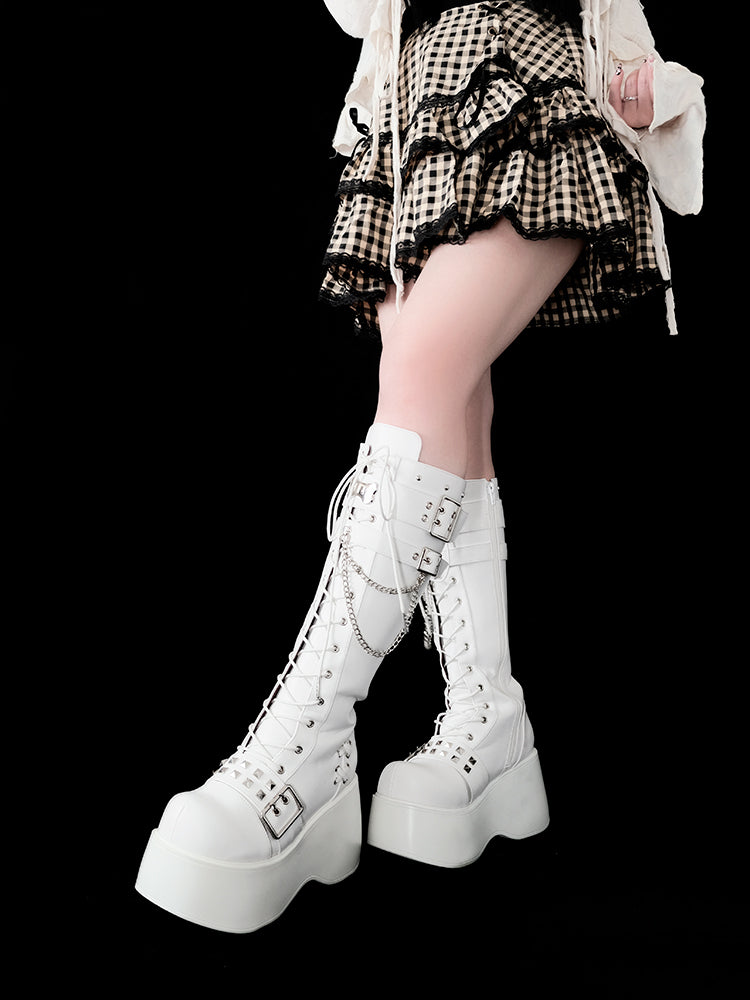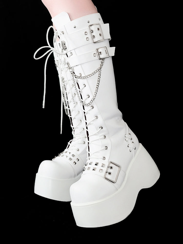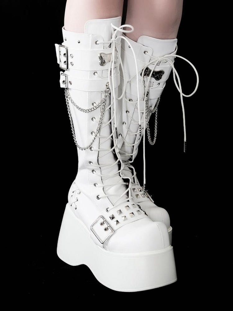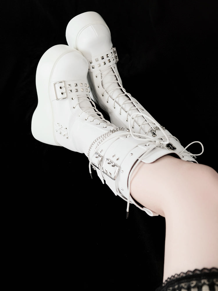 骨型メタルプレート マットホワイト パンク ウェッジ プラットフォーム ニーハイブーツ