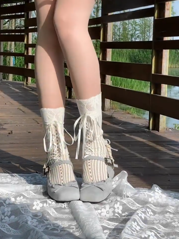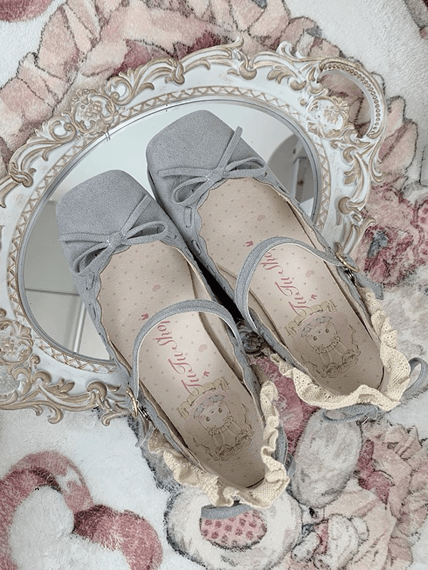 Blue Classic Mary Jane Shoes - Square Toe Mid Heel with Front Bow, Lace Detail & Lace-up Design Heel