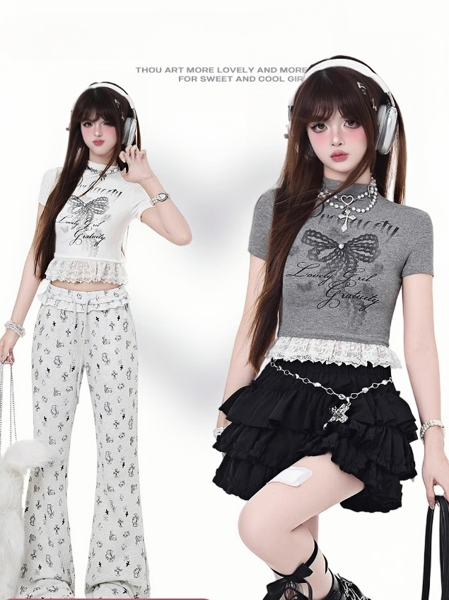 リボンプリントのグラマラスなクロップドネックとレースヘムのTシャツ グレー/ホワイト モック