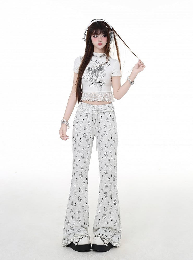 グレー/ホワイト モックネック ボウプリント レースヘム グラマラス クロップドTシャツ