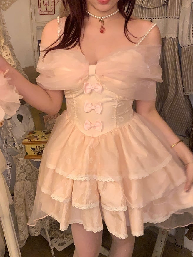ピンクと白のオールドスクールロリータファッションドレス、蝶結びディテール、ロリータJSKセット