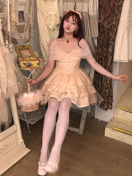 Bow Skirt Off-Shoulder Champagne Straps Dress with and Big Beaded Tiered