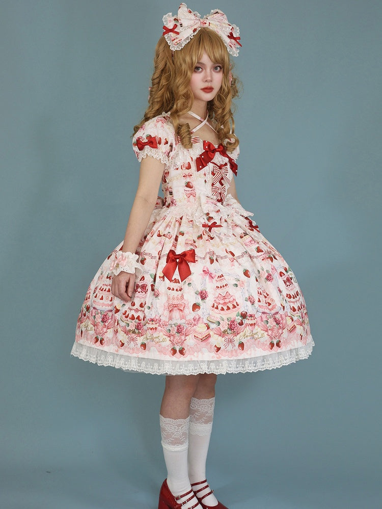 リボンスイートセットプリント ホワイトストロベリーアクセント / ロリータフルケーキドレス