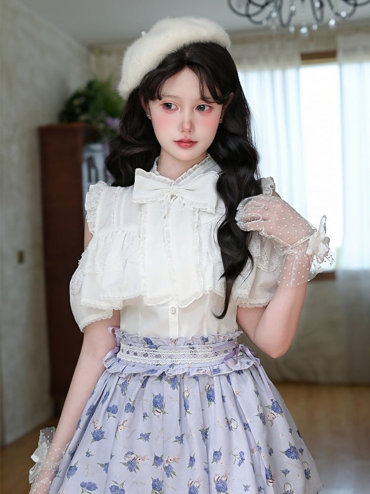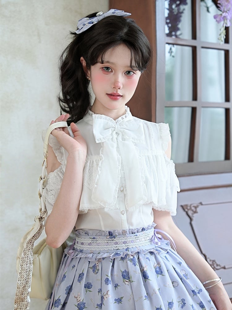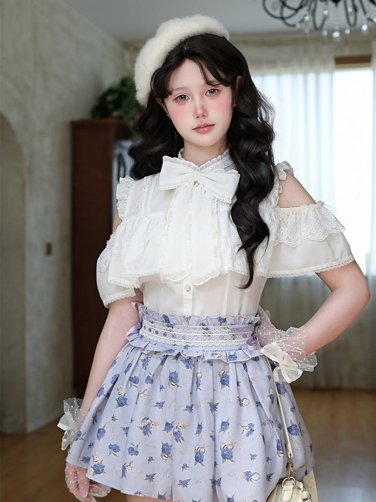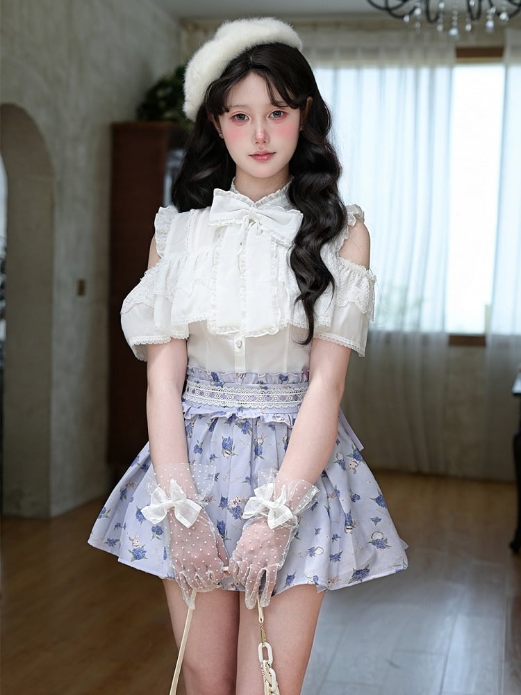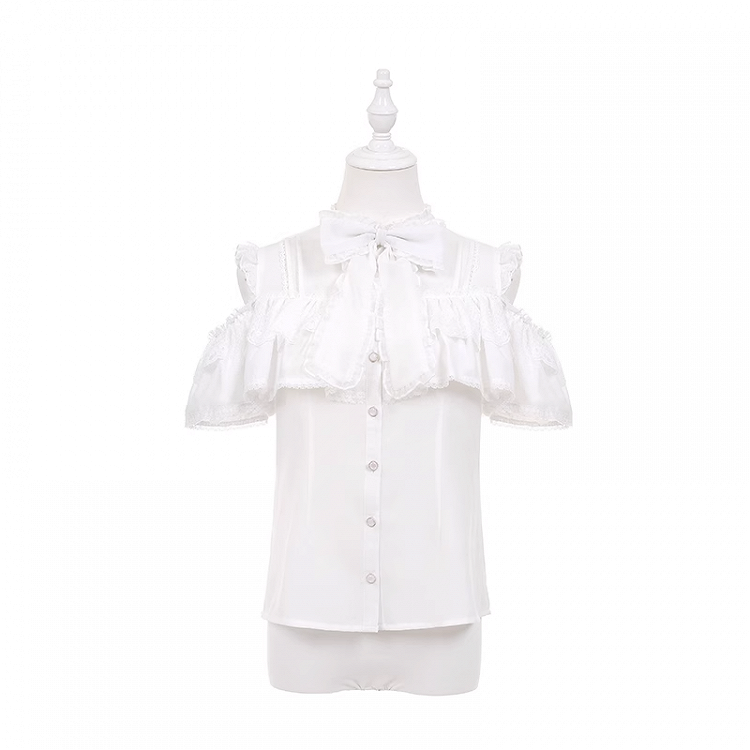 ホワイトオープンショルダービッグリボンネックラインシフォンブラウス