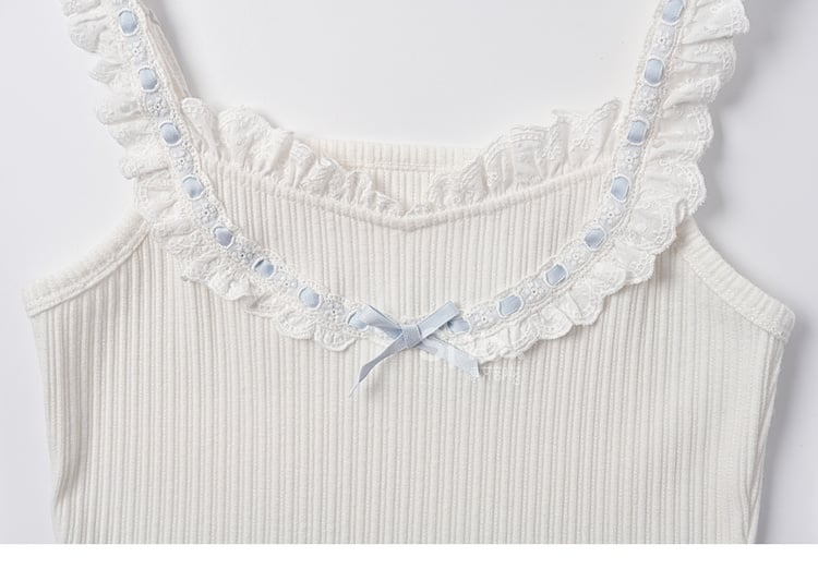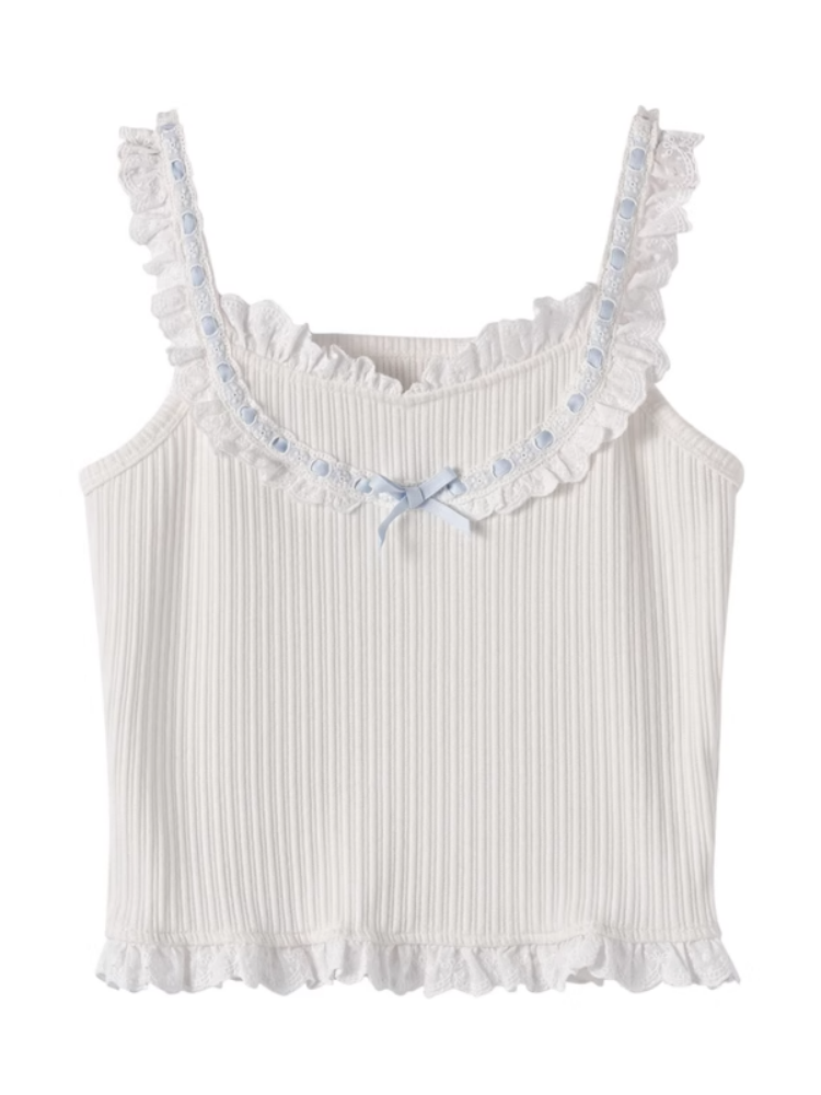 コントラストブルーの蝶結び、ホワイトのフリルレーストリムのスイートなノースリーブトップス
