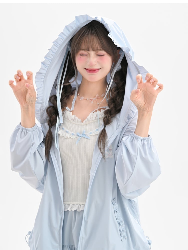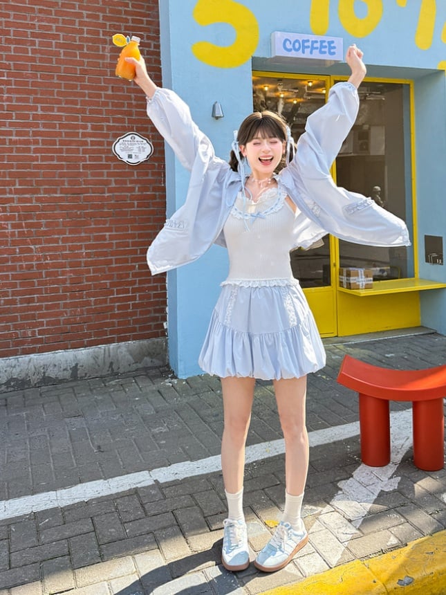 リボン結びのブルーコントラストホワイトフリルレーストリムのスイートノースリーブトップス