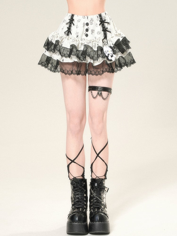 グレーの魅力的なキティとクロスプリントの蝶結びディテール、レーストリムのティアードスカート