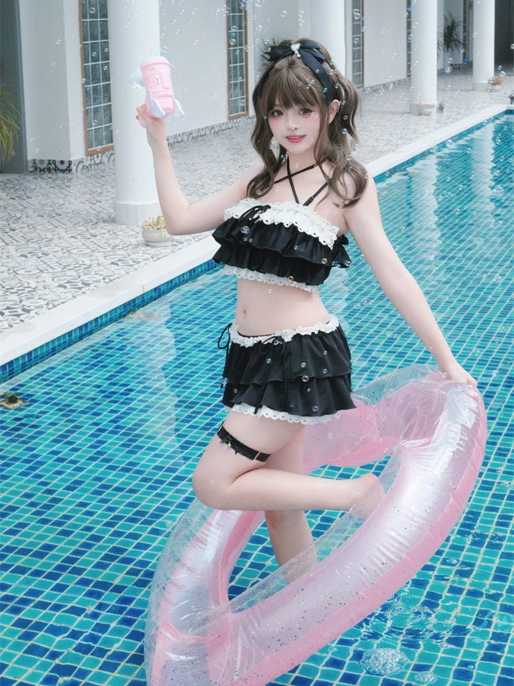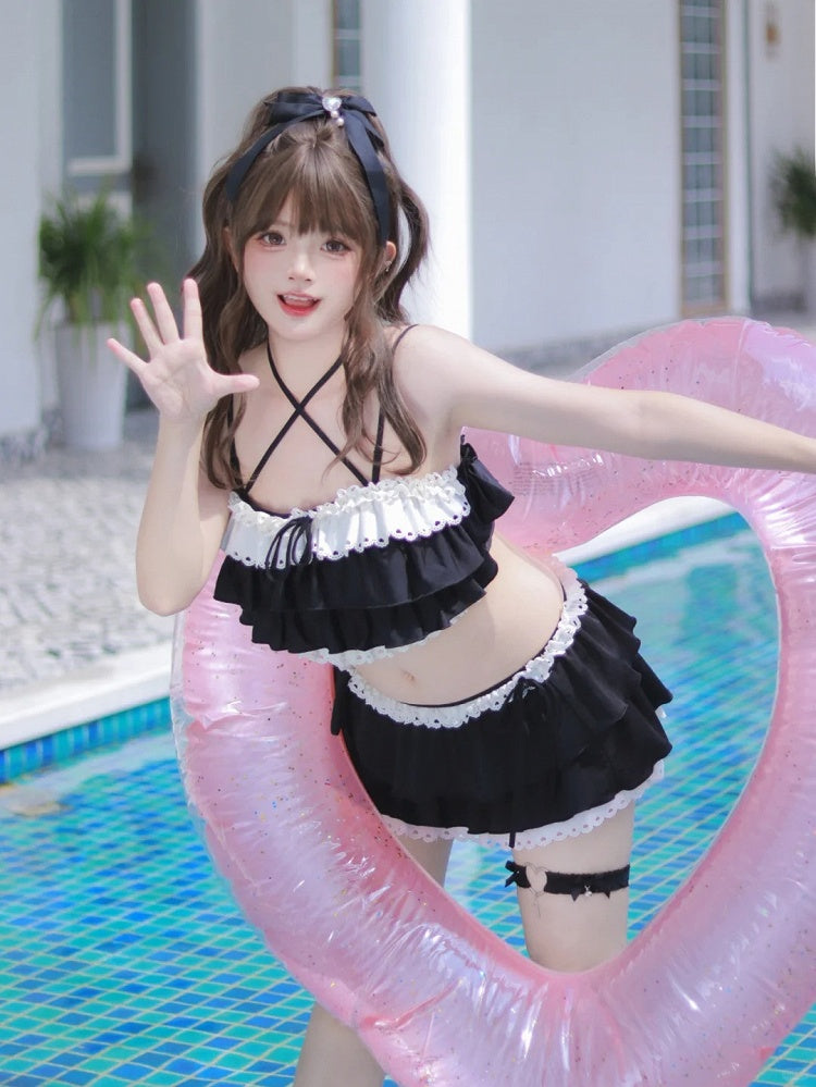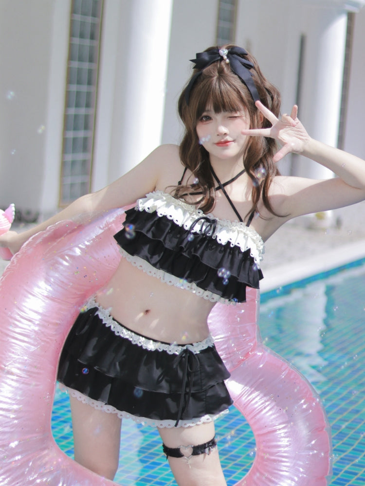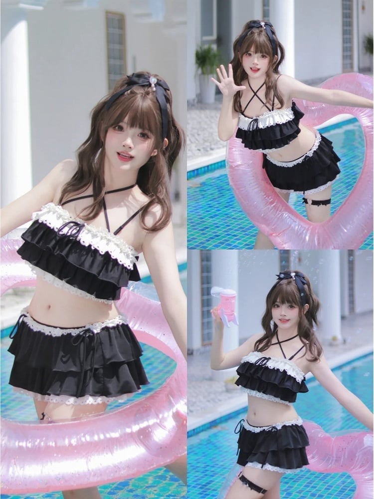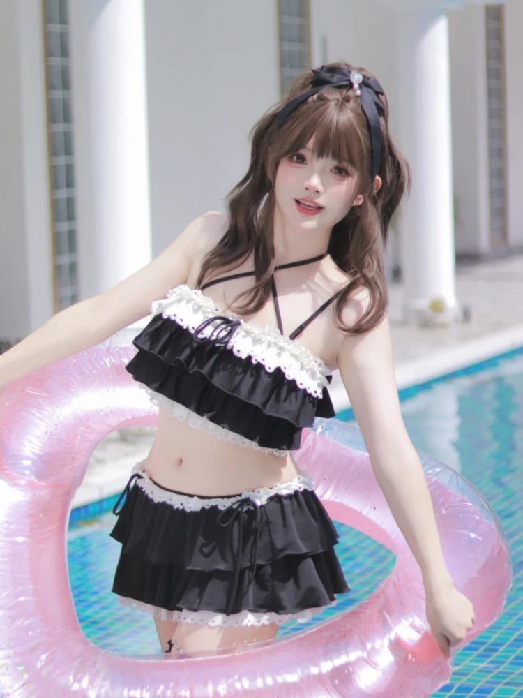 ブラックのティアードフリル、蝶結びディテール、レーストリムの水着