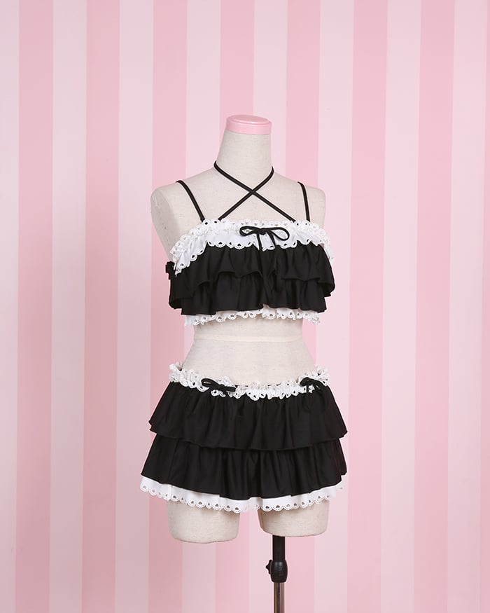リボンディテール レーストリム 水着 ブラック ティアードフリル