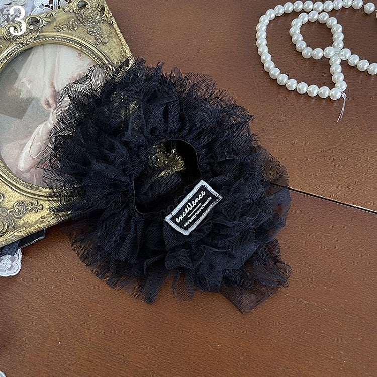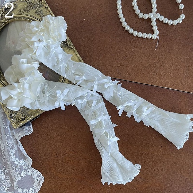 Black Fishnet Tights/White Bowknot Cut-out Design Leg Warmers/Black Lace Ruffle Leg Loop