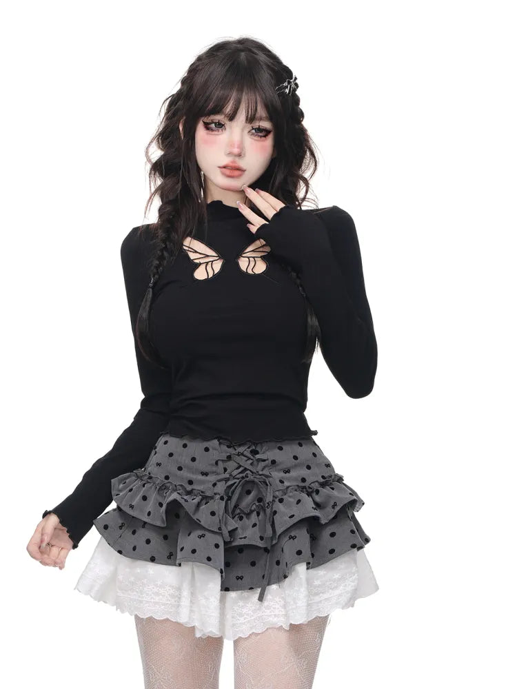 蝶結びの水玉模様のグレーのレースアップスカートのパターンと白いティアードディテール