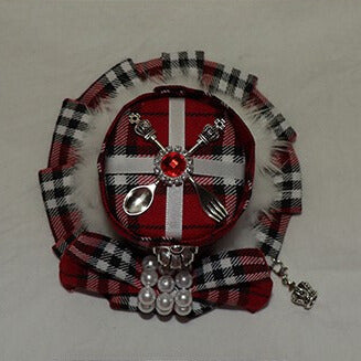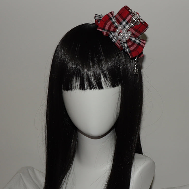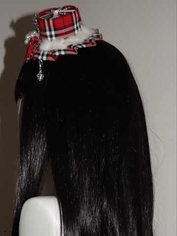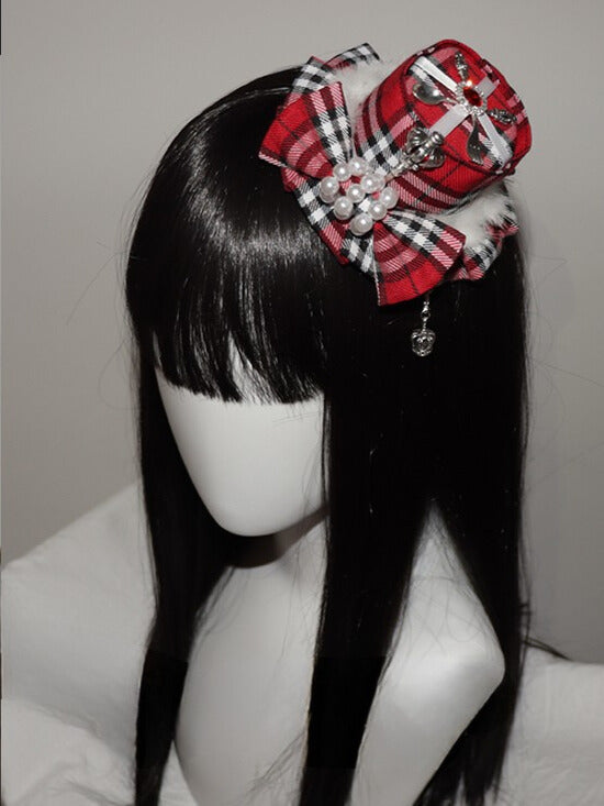 赤いビーズで飾られた蝶結びの王冠チャームとチェック柄のミニハット