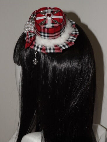 リボン結びの赤いチャームミニ装飾クラウンパターンチェック柄帽子ビーズ