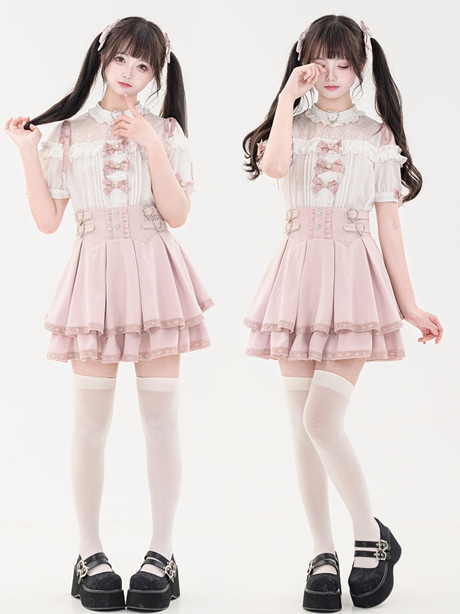 ピンクのジライケイラインストーンハート装飾蝶結びプリーツディテール半袖シャツ