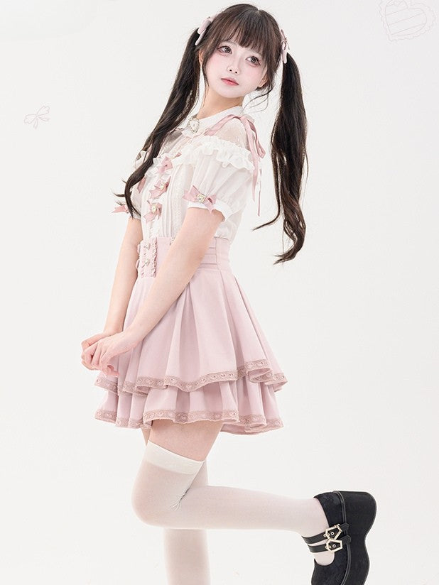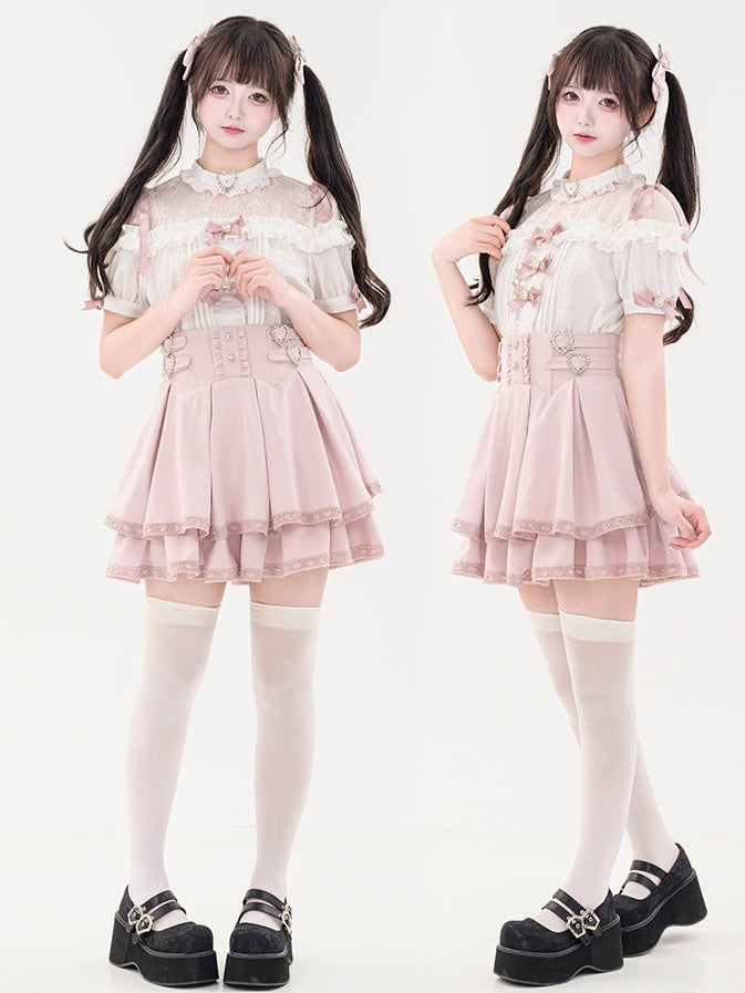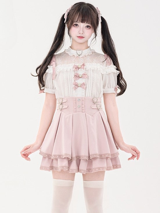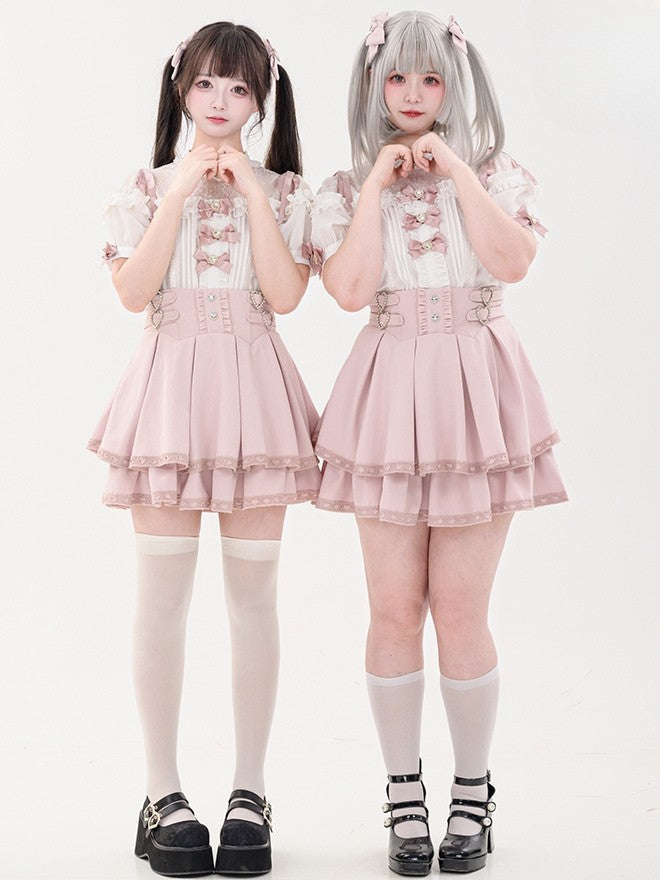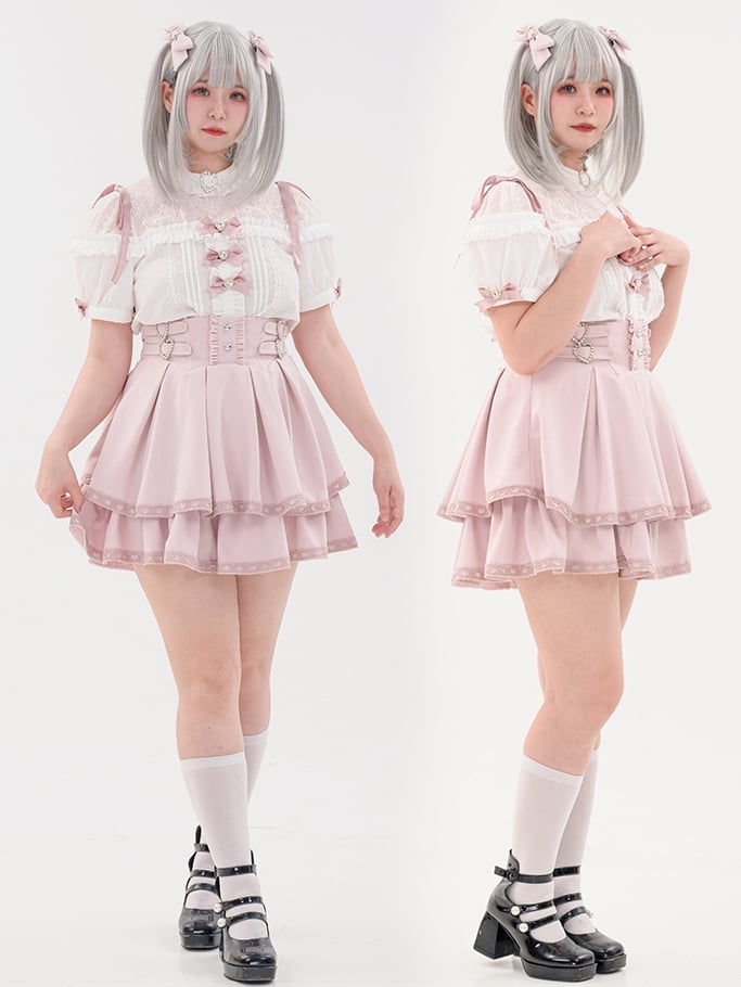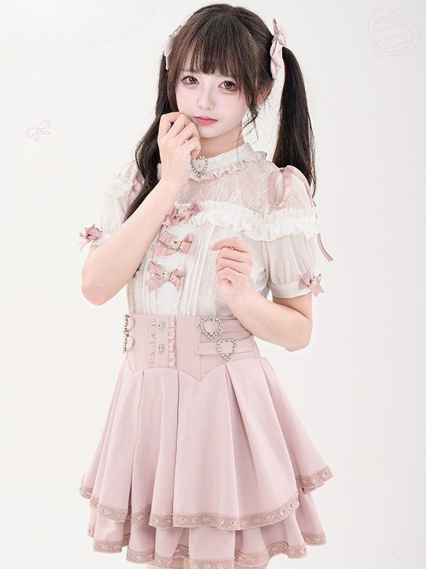蝶結びのショート丈ジライラインストーンシャツプリーツピンクのディテール袖装飾ケイハート
