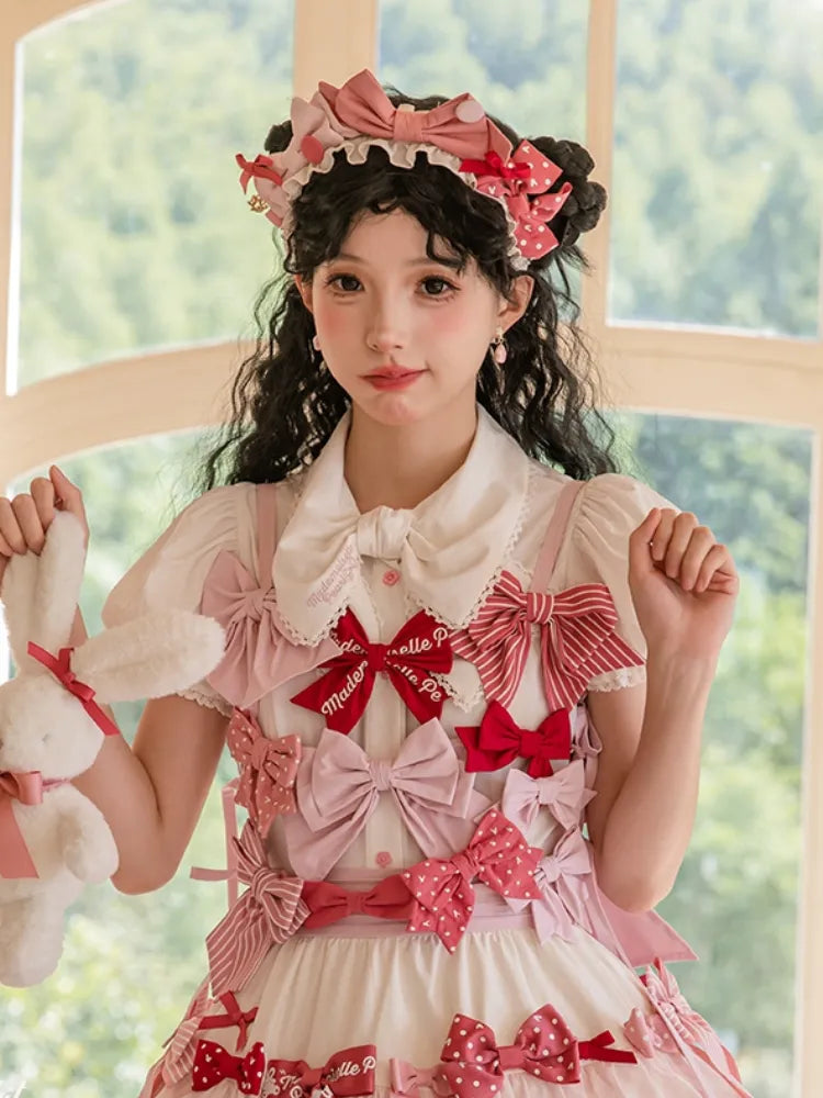 ピンクと白のオールドスクールロリータファッションドレス、蝶結びディテール、ロリータJSKセット