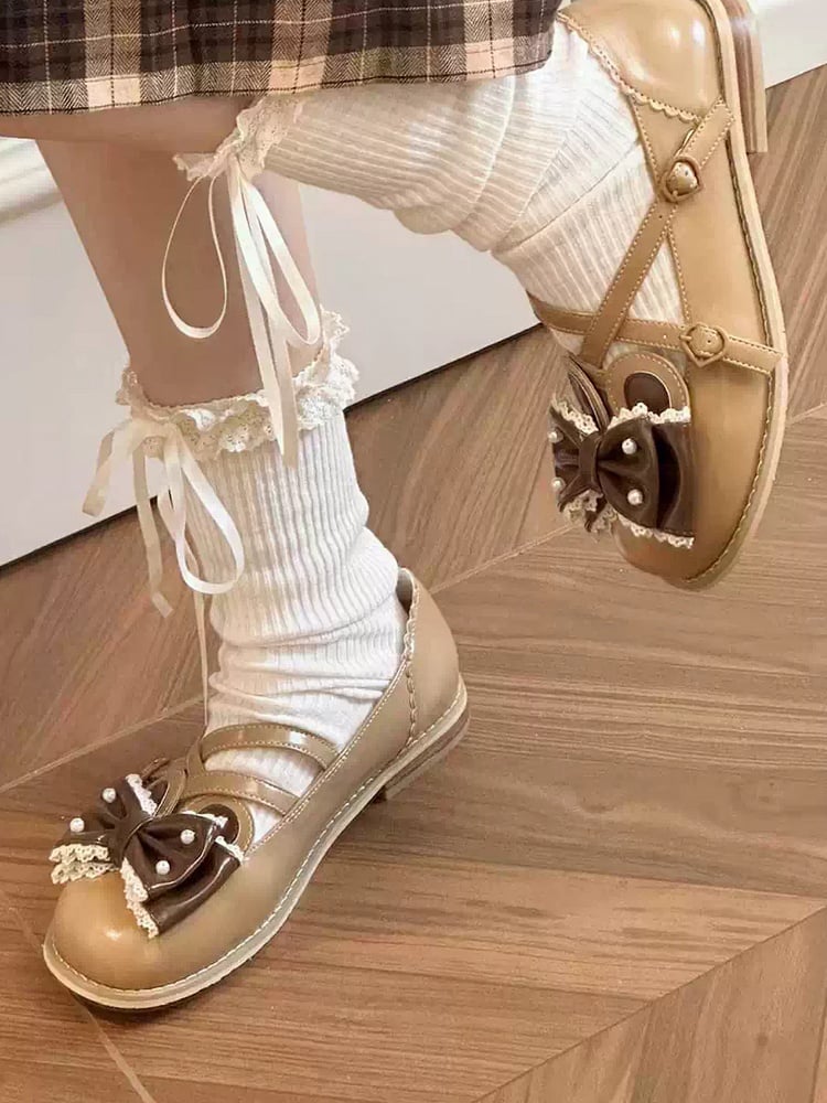 上部に茶色のビーズで飾られたリボンとクロスデザインのウサギ耳ロリータシューズ