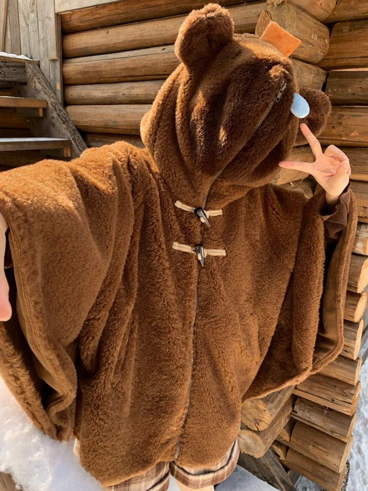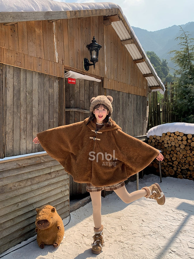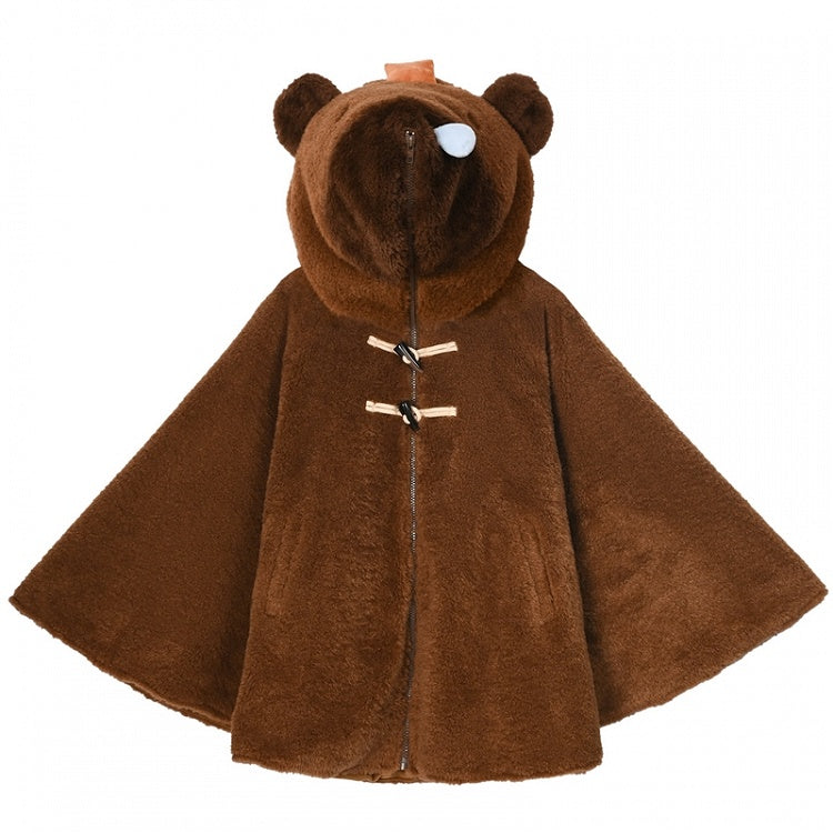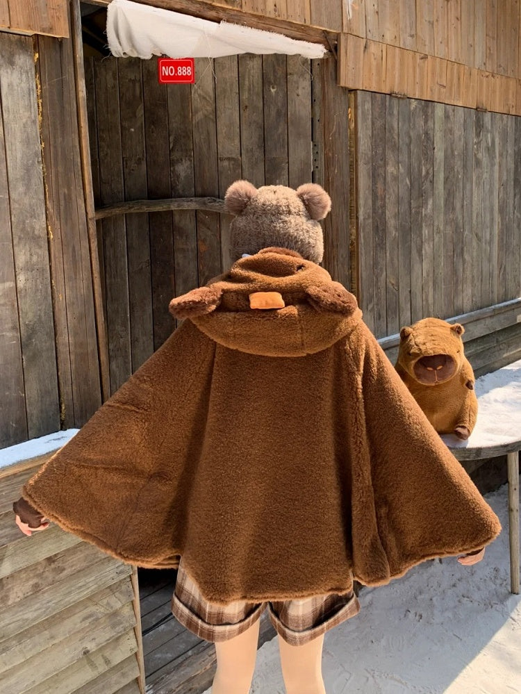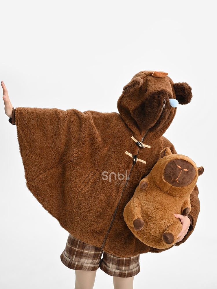 ブラウンのキュートなカピバラ柄フード付きジップ開閉フリースケープで、暖かく可愛く過ごしましょう。遊び心のあるカピバラ柄フードと着脱しやすいジップ開閉のデザインで、冬の間ずっと暖かくキュートなケープです。
