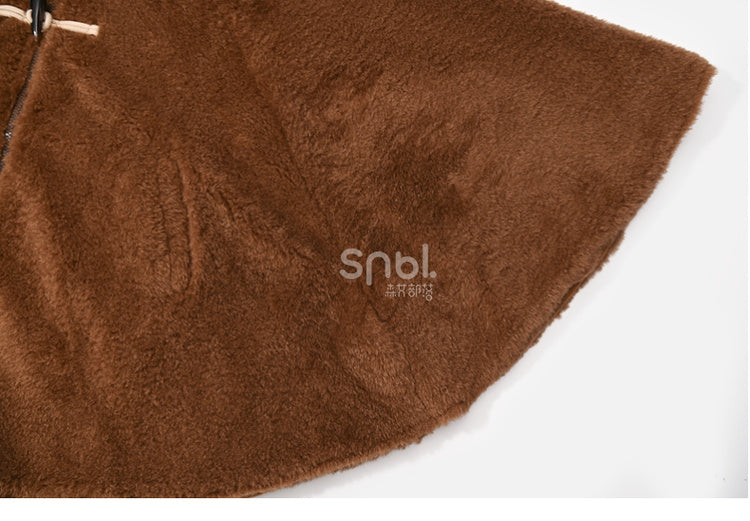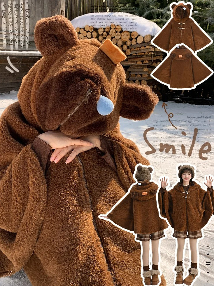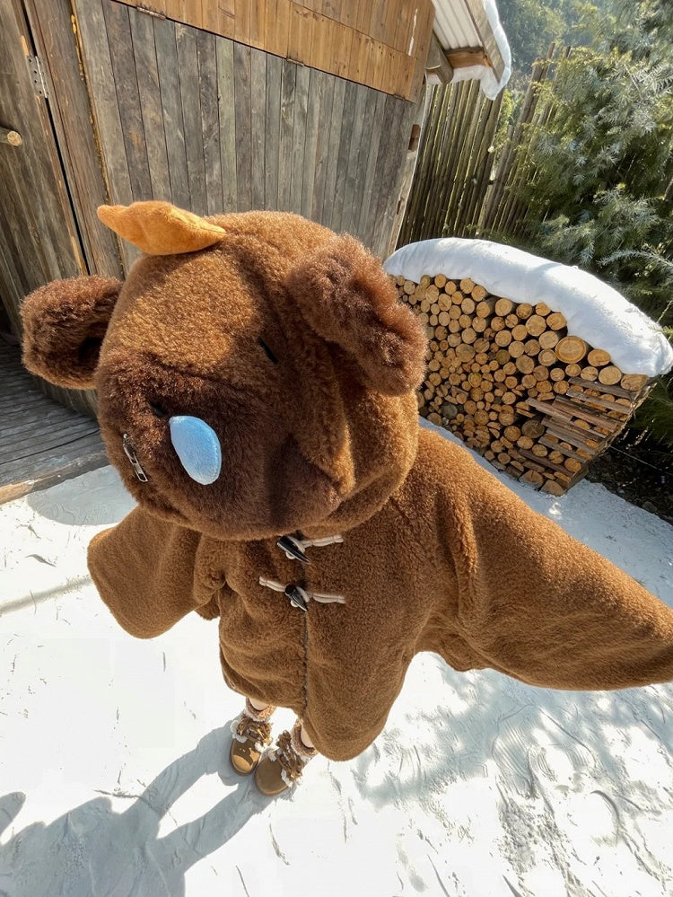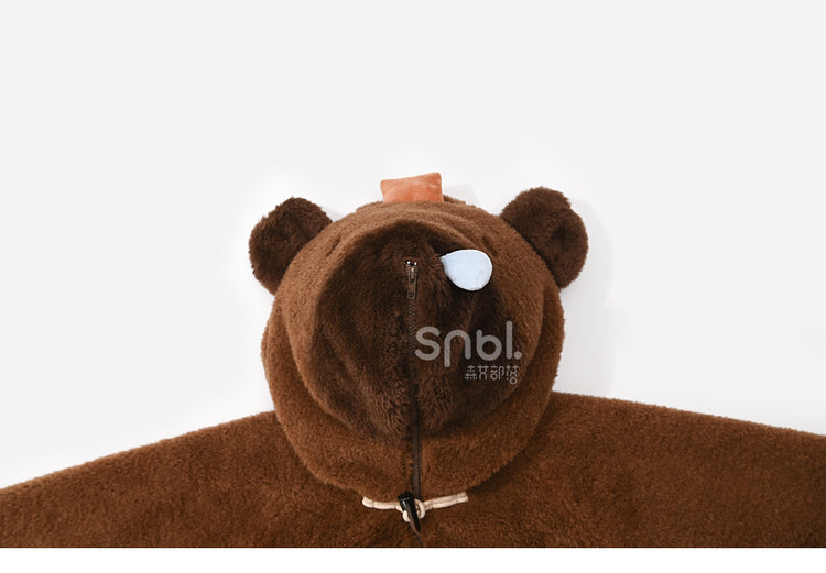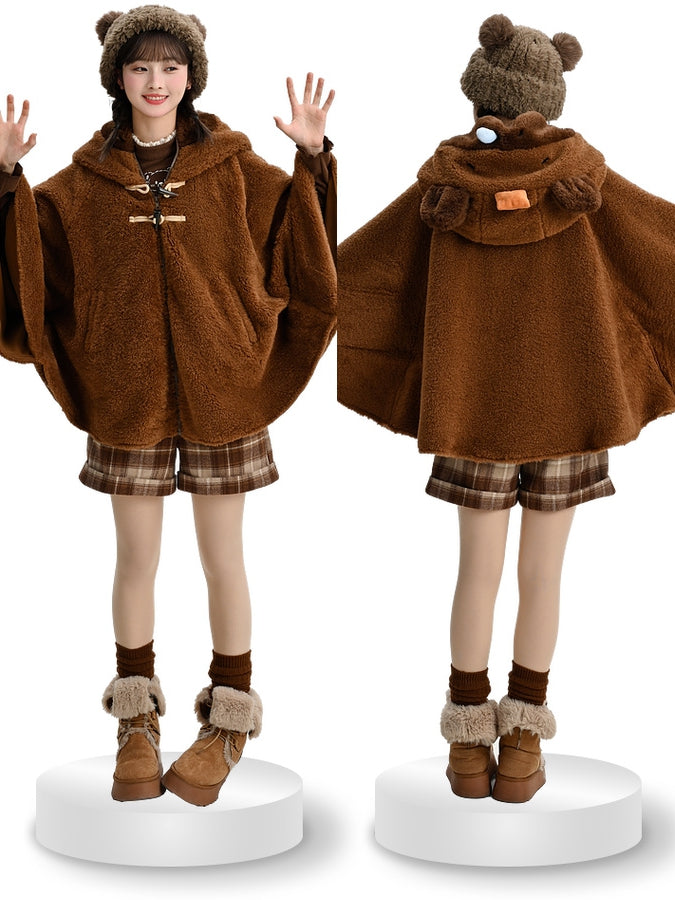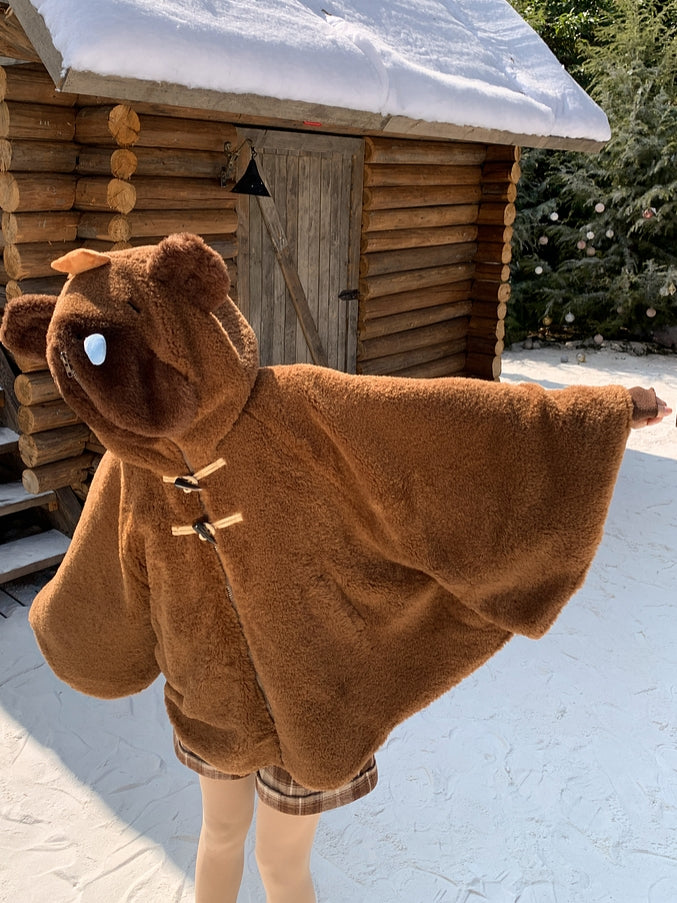 ブラウンのキュートなカピバラ柄フード付きジップ開閉フリースケープで、暖かく可愛く過ごしましょう。遊び心のあるカピバラ柄フードと着脱しやすいジップ開閉のデザインで、冬の間ずっと暖かくキュートなケープです。