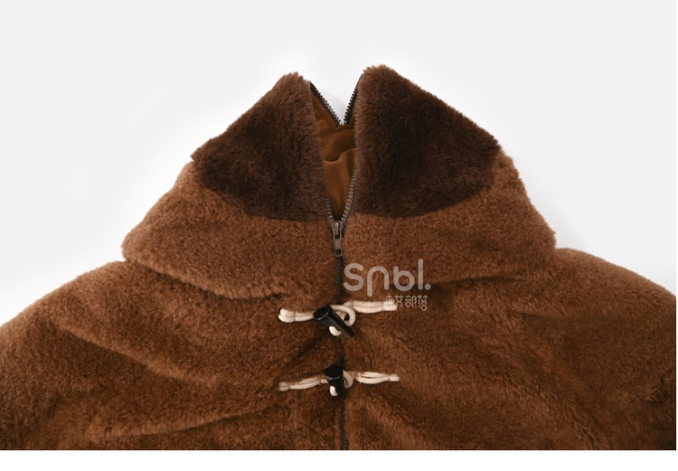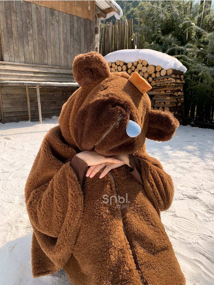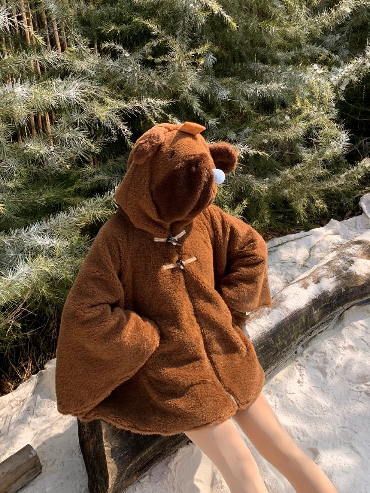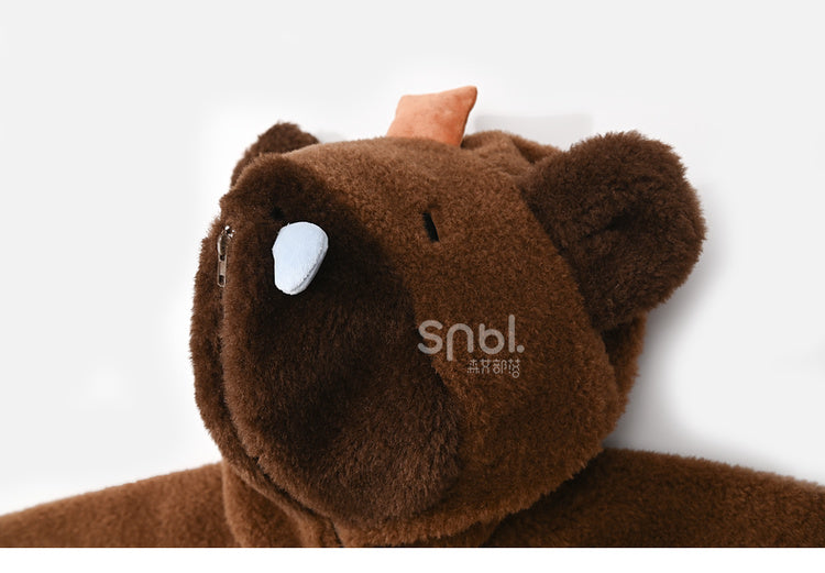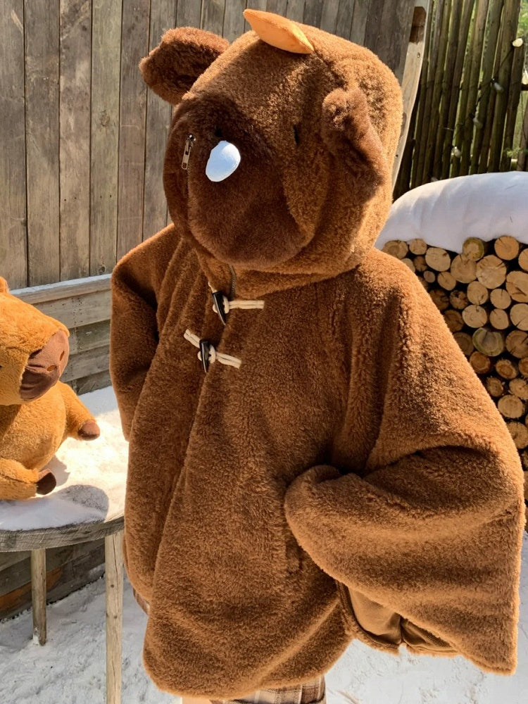 茶色のかわいいカピバラのフード付きジップ開閉フリースフード付きケープ