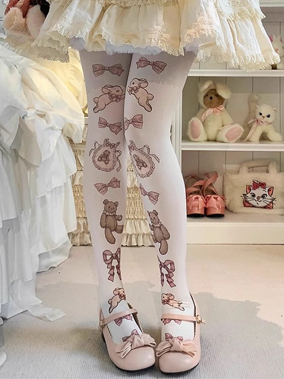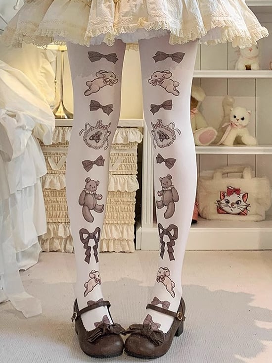 キュートでチャーミングなブラウン/ピンクのバニー&ベア柄のスイートロリータタイツは、どんなコーディネートにも遊び心をプラスしてくれます。柔らかく快適な履き心地のタイツは、愛らしいバニーとベアが描かれており、きっと笑顔に。どんなスタイルにも甘さをプラスしてくれます。