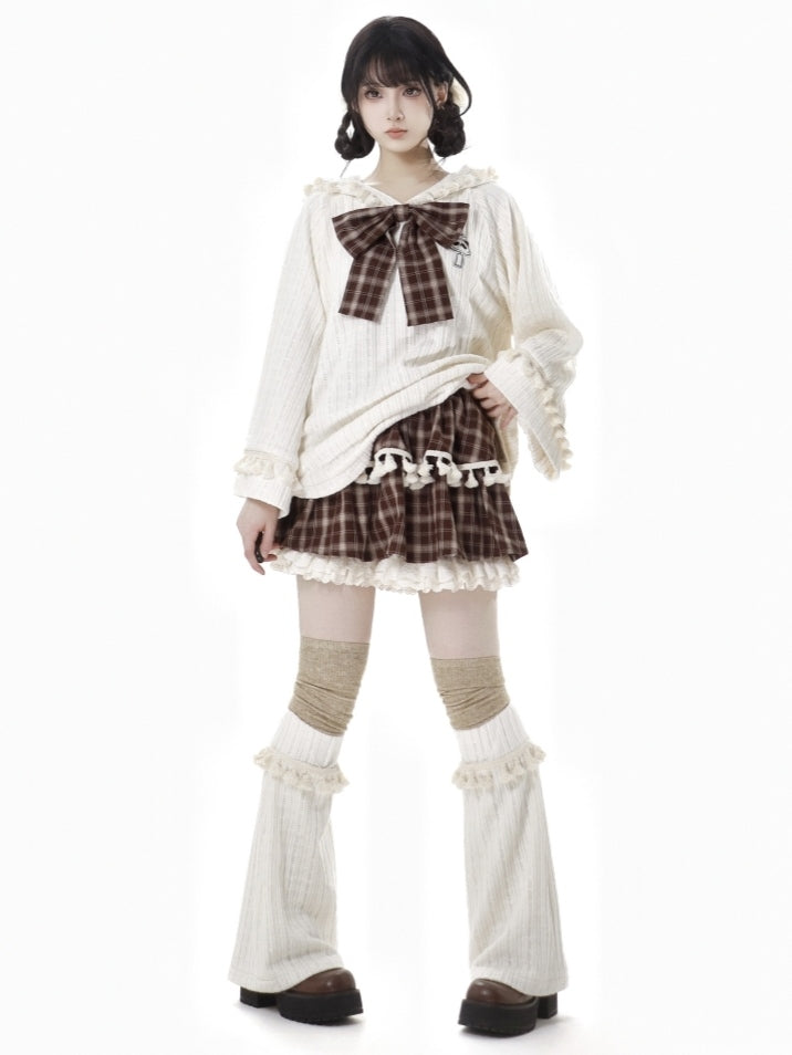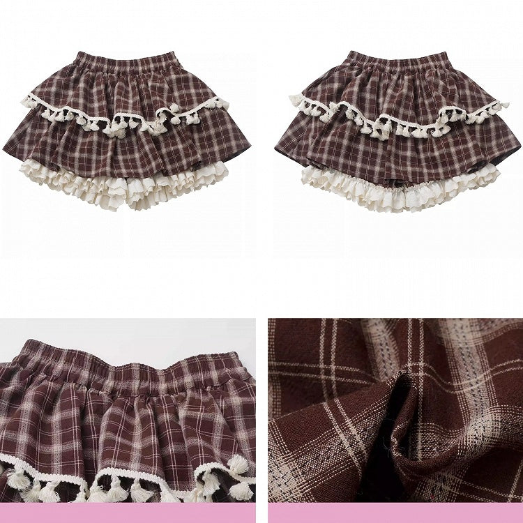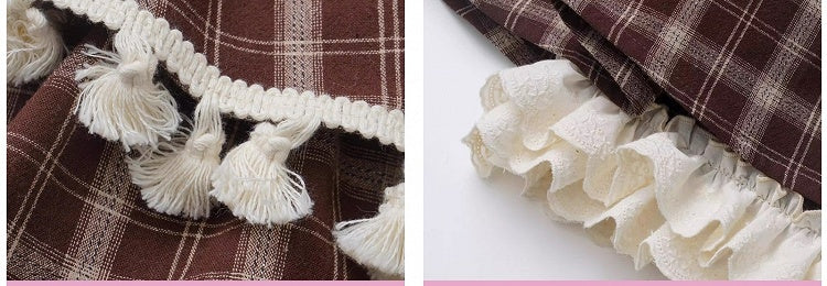 ブラウンのチェック柄ティアードスコート、フリル袖口、フリンジトリム