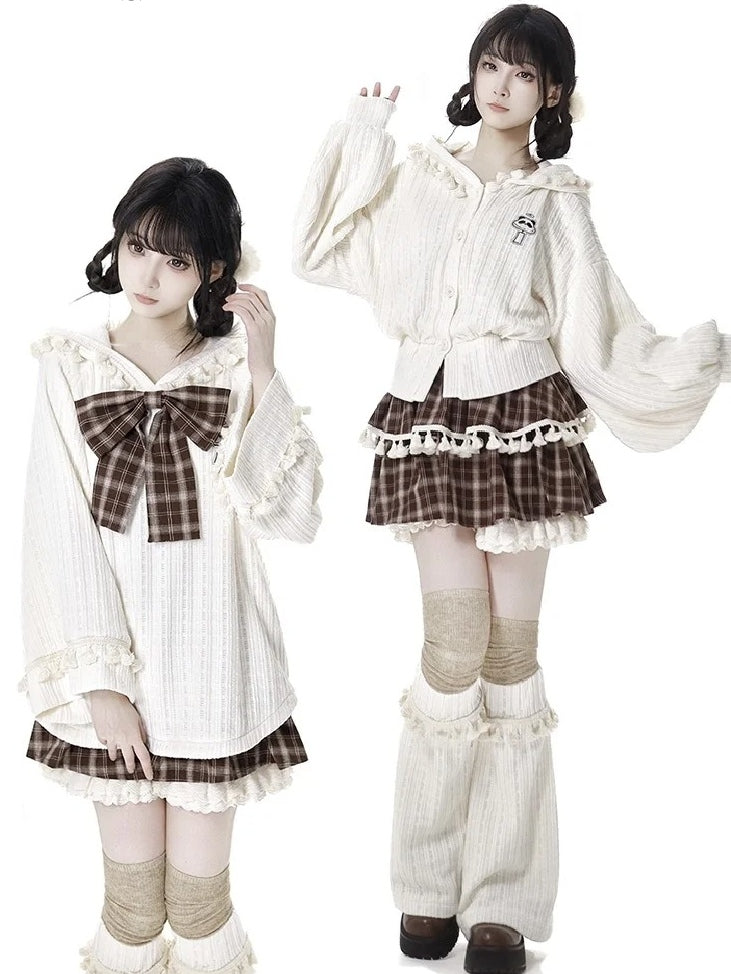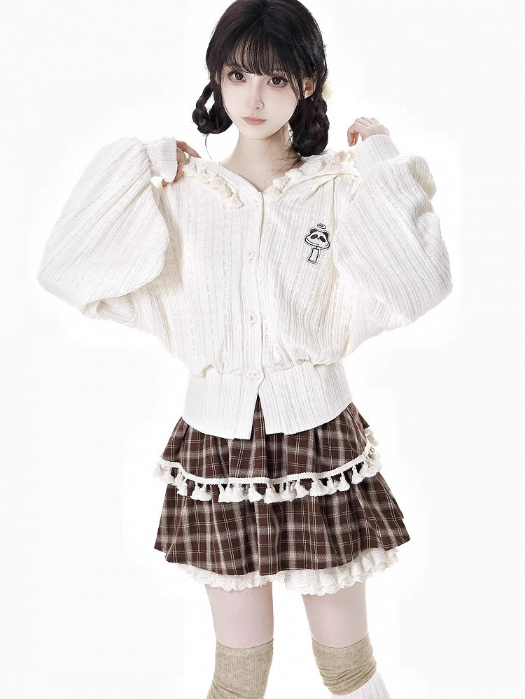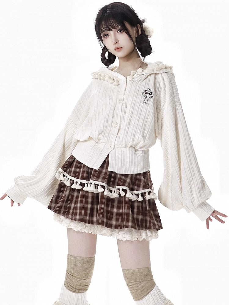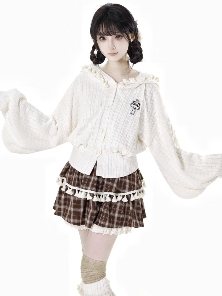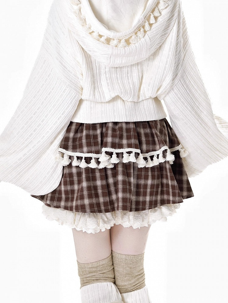 ブラウンのチェック柄ティアードスコートで、ワードローブにキュートなアクセントをプラス。フリル袖口とフリンジトリムが特徴のこのスコートは、個性的でスタイリッシュな印象です。ティアードデザインがシルエットを美しく見せ、チェック柄がクラシックな雰囲気を添えます。どんなカジュアルなお出かけにもぴったりです。