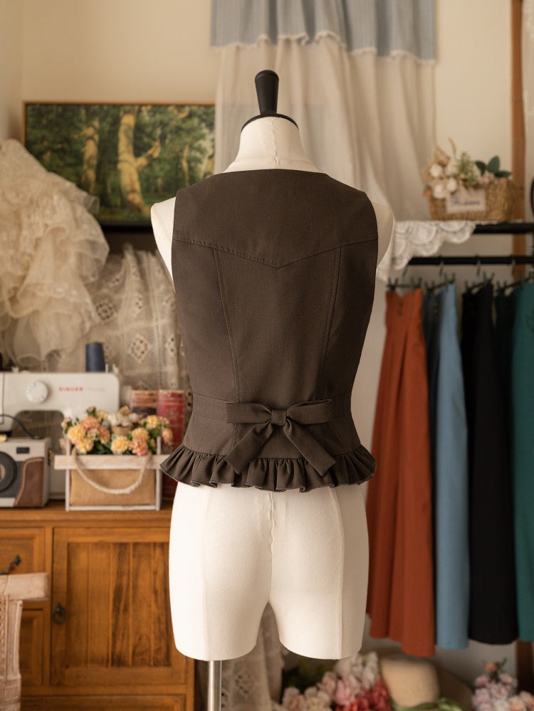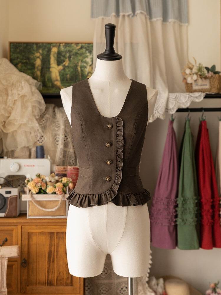 ブラウンのフリルトリム、フロントボタンプラケットウエストコート