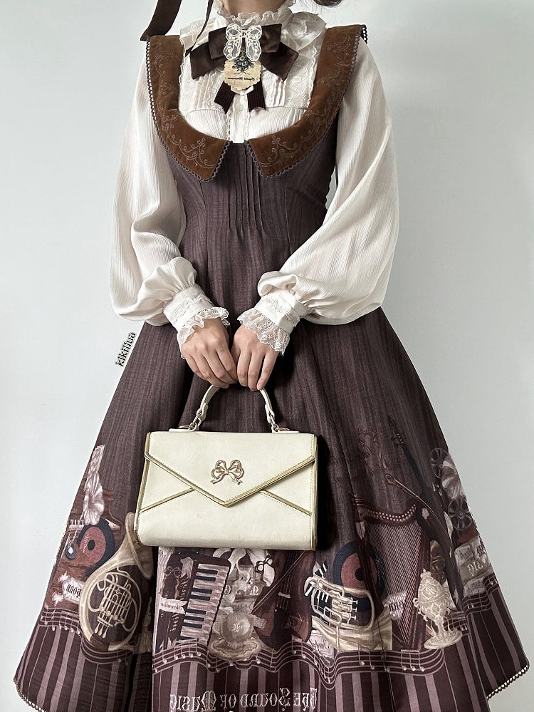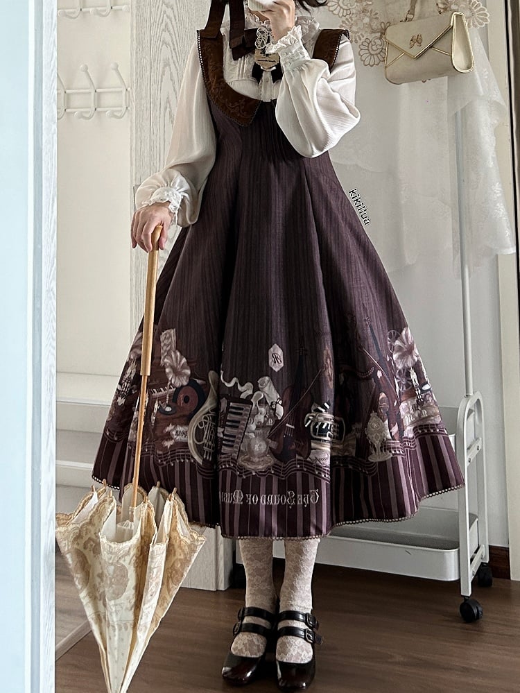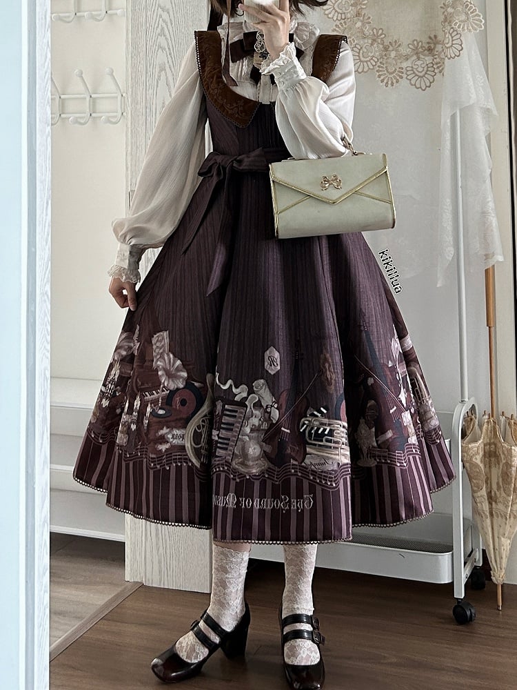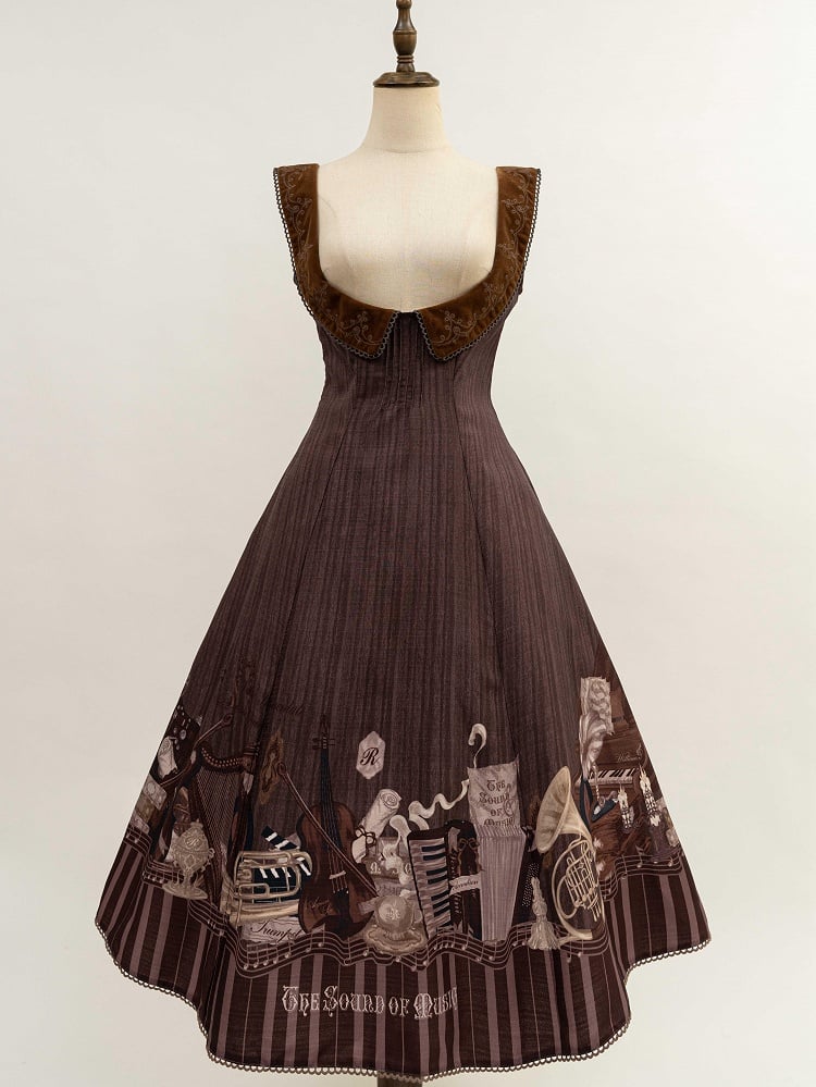 ブラウンのアンダーバストバイオリン&ピアノプリントのエレガントなロリータドレス