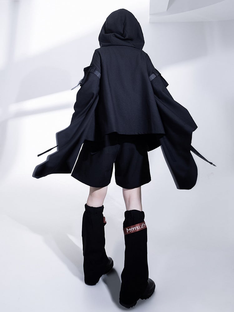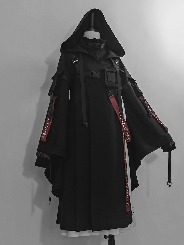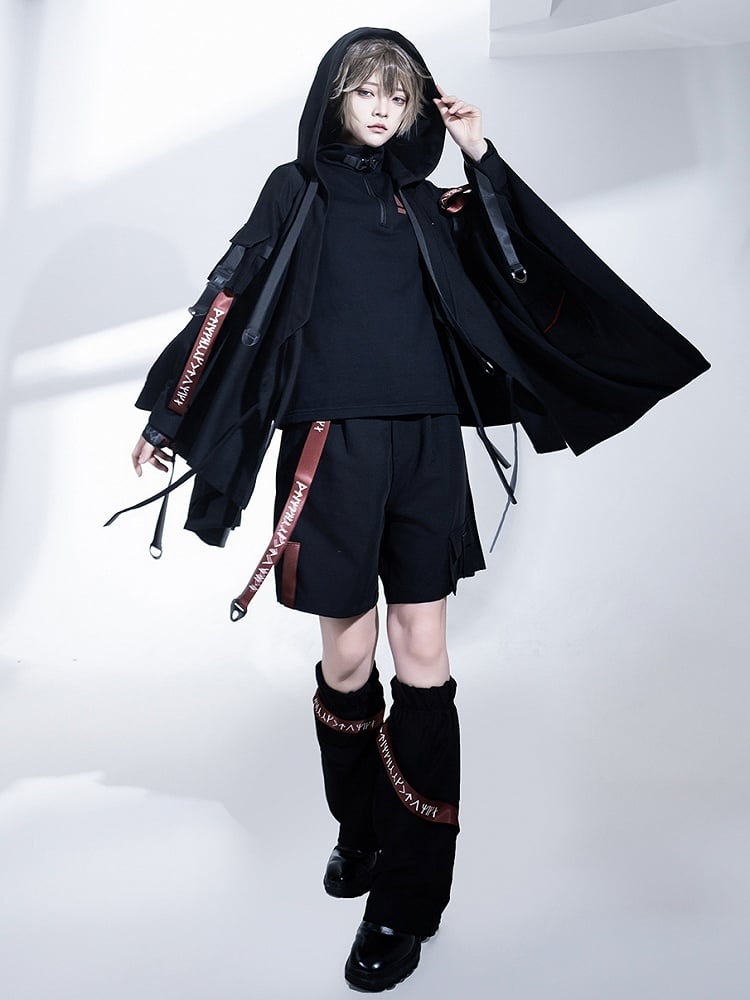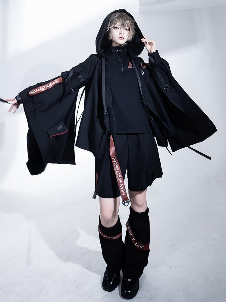 バックルフード付きロリータテックウェア王子ストラップジャケット ブラック