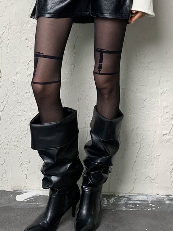 ブラック Y2K パンク バックル プリント デザイン タイツ