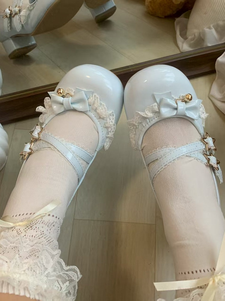 Star Buckle, Lace Details and Bell Embellished Bow PU Blue Low-heel Mary Janes in Sweet Lolita
