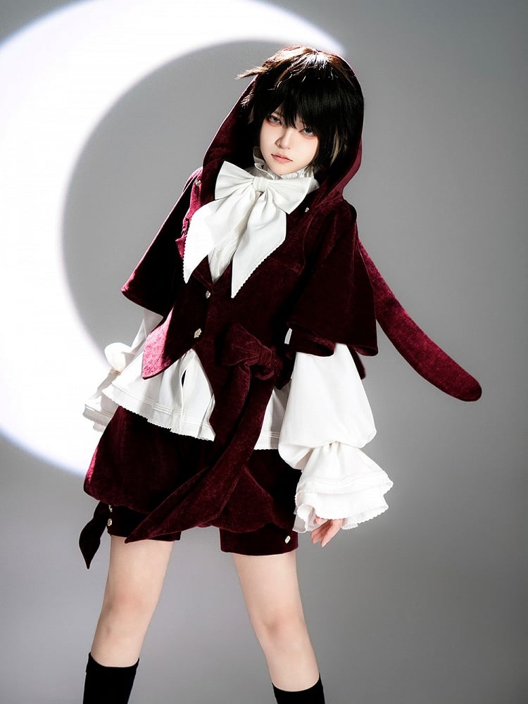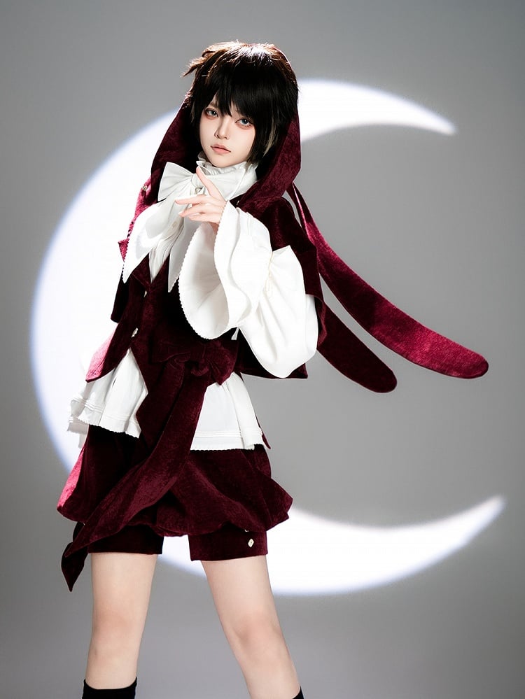 ワインレッド王子ロリータベルベットジャケット、特大うさぎ耳フード付き