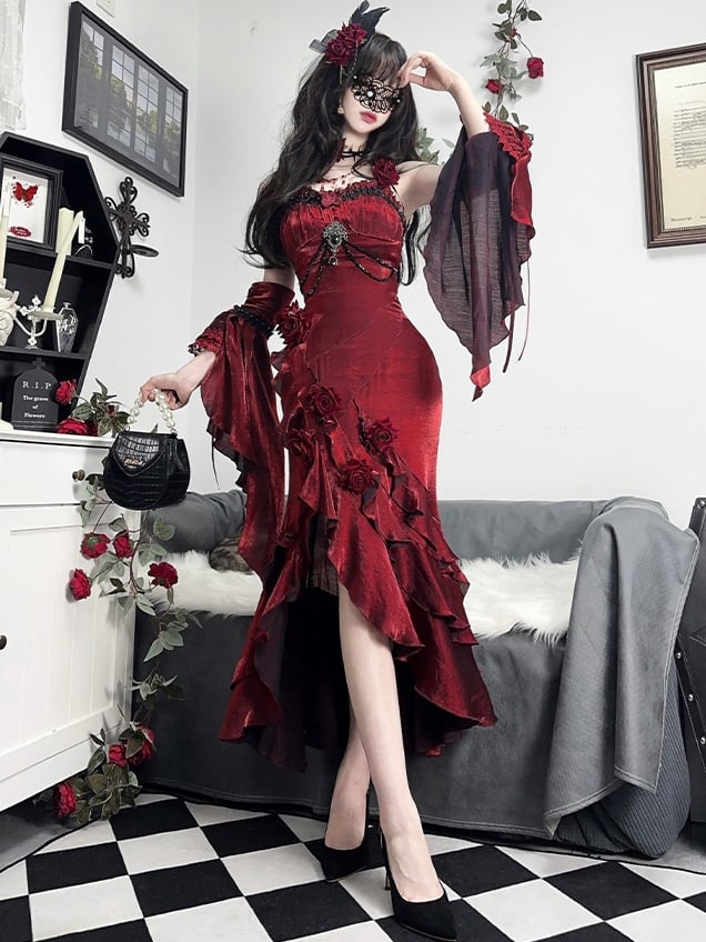 取り外し可能なフリル袖付きバーガンディレッドのイブニングドレス、ロゼットマーメイドドレス