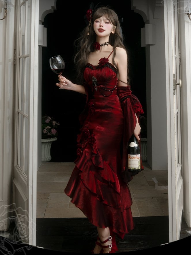 このゴージャスなバーガンディレッドのイブニングドレスで、舞踏会のベルになりましょう。魅力的なマーメイドシルエットと取り外し可能なフリルスリーブが特徴のこのドレスは、あらゆるフォーマルなシーンに最適です。精巧なロゼット装飾が、この美しいドレスにさらなるエレガンスを添えています。このドレスで、あなたのスタイルをワンランクアップさせ、周りの注目を集めましょう。