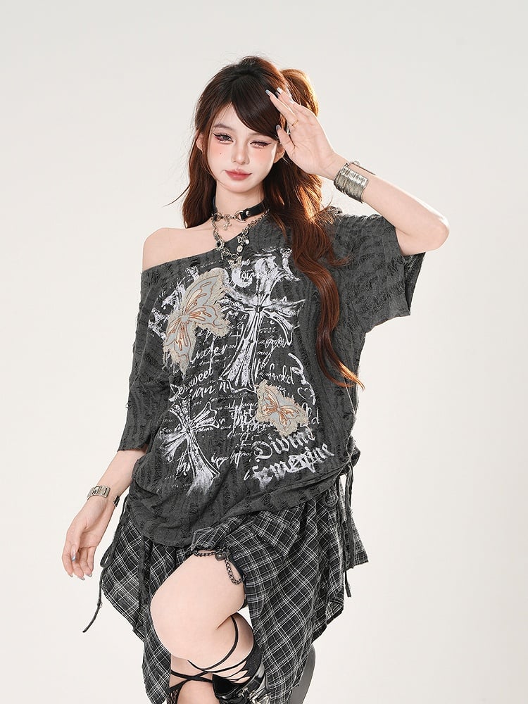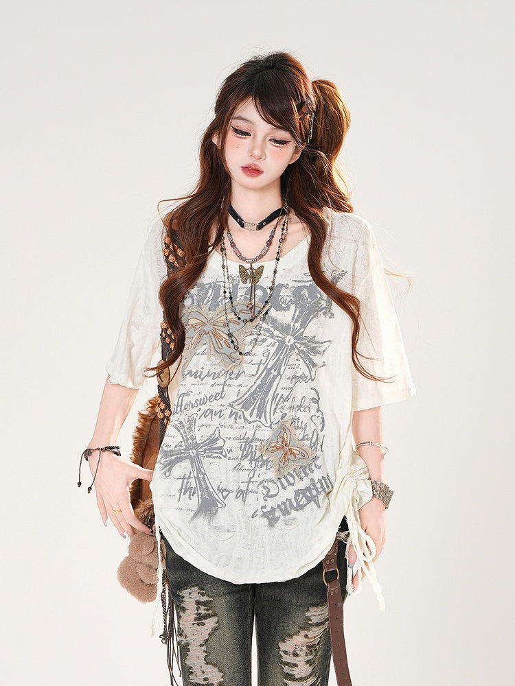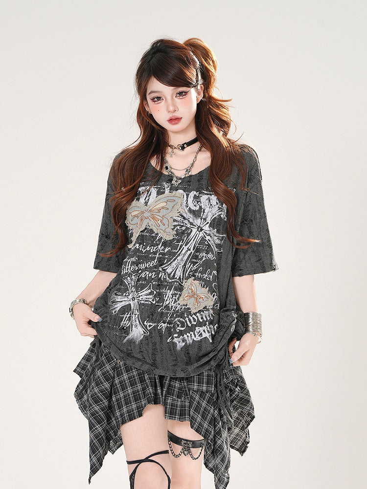 バタフライアップリケ クロスプリント ダメージ加工 ホールズ アプリコット/グレー Tシャツ