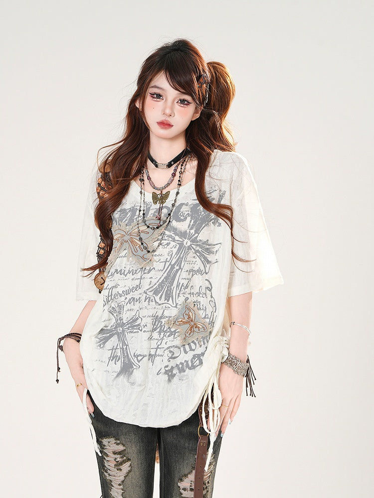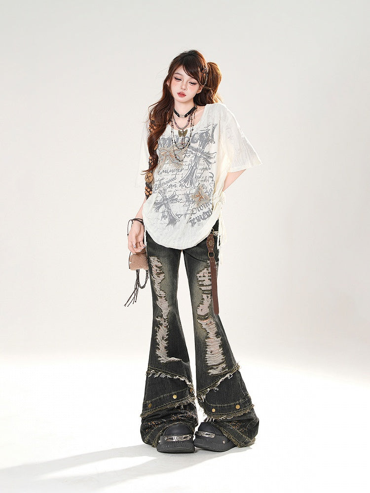 バタフライアップリケ クロスプリント ダメージ加工 穴あき