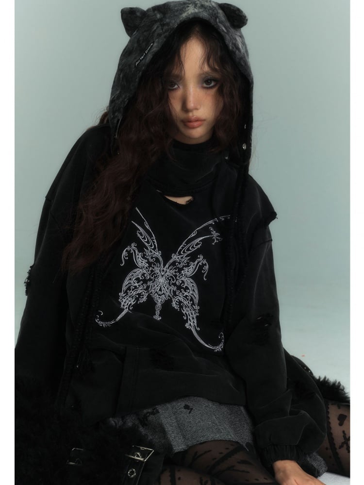 バタフライ ブラック ディストレスト ホールズ パンク パーカー