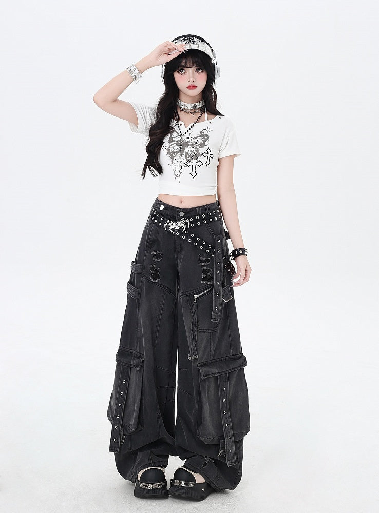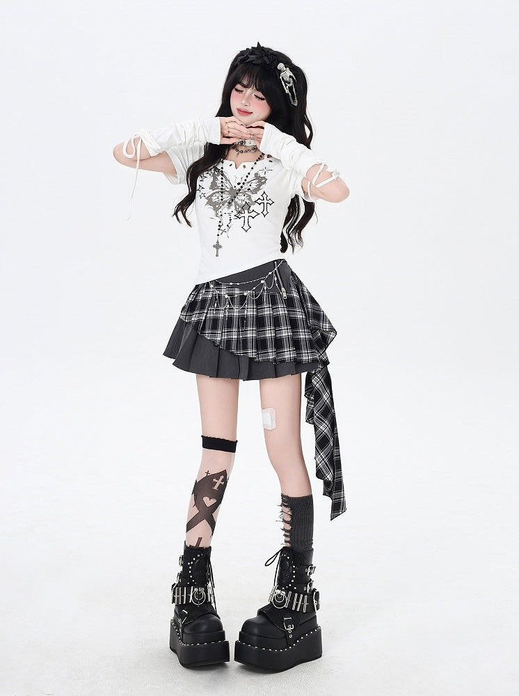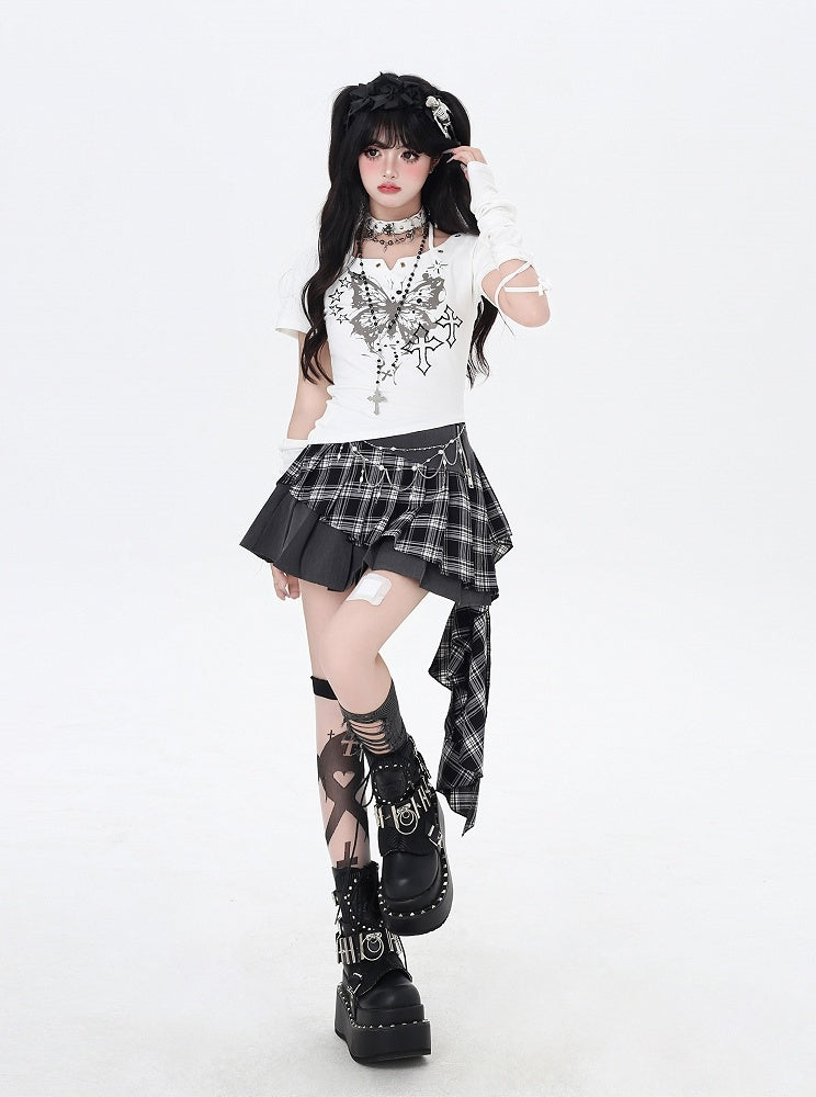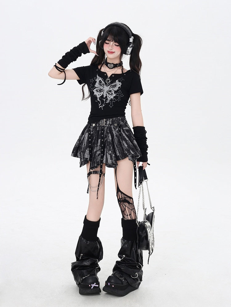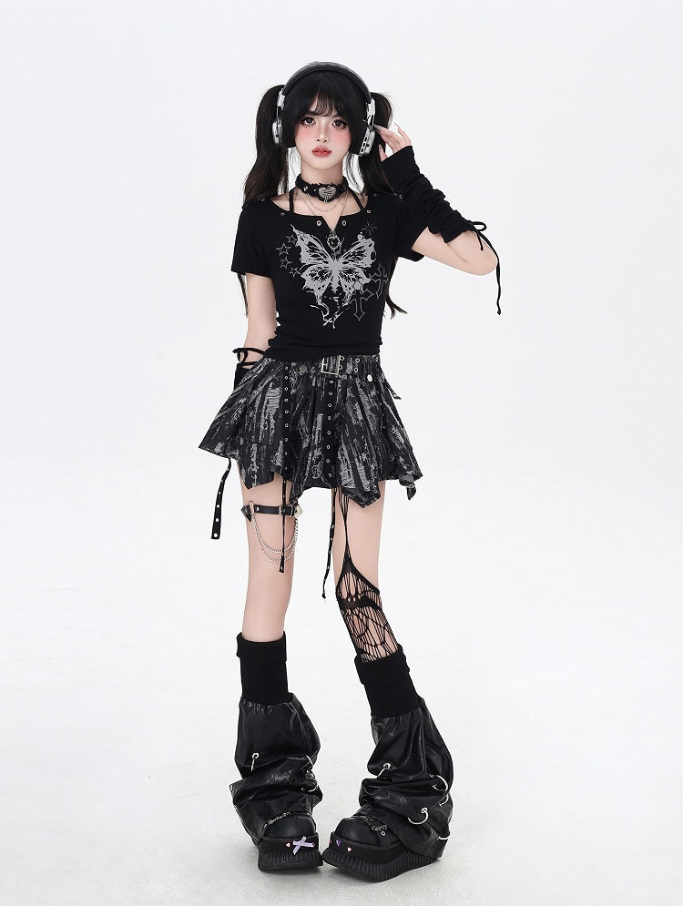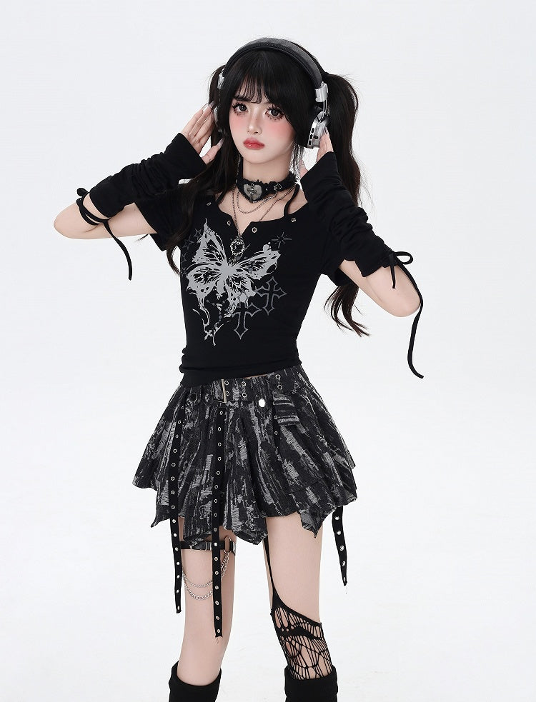 バタフライプリントホルターネックTシャツアームウェア(ブラック/ホワイト)
